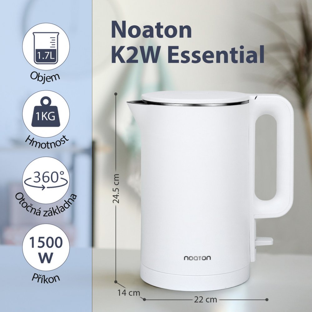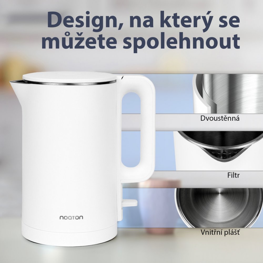 Rychlovarná konvice Noaton nabídne objem 1,7 l a přináší snadnou a rychlou přípravu nápojů. Konvice je vyrobena z nerezu, neobsahuje škodlivé látky a není náchylná k absorbování pachů ani chutí. Je vybavena speciálním dvojitým pláštěm, díky kterému její povrch nedosahuje vysokých teplot, proto se nemusíte bát možného popálení. Zvýšení bezpečnosti má na starost automatické vypnutí při nedostatku vo...