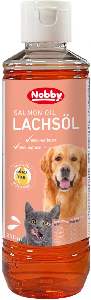 100% přírodní lososový olej je doplněk stravy pro psy. Lososový olej vyrovnává poměr mezi Omega 3 a Omega 6 mastnými kyselinami a významně snižuje hladiny cholesterolu v krvi. Při pravidelném používání lososového oleje bude srst vašeho psa hustá a lesklá.