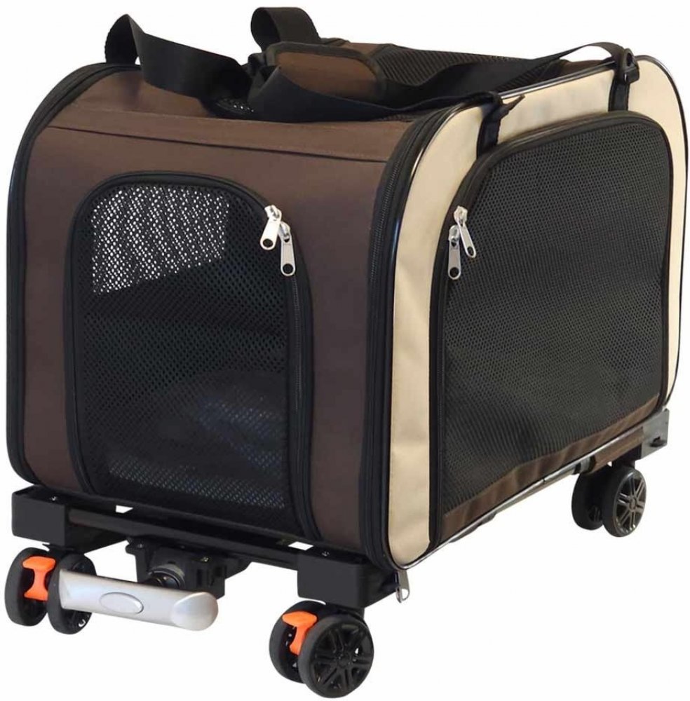 V tomto praktickém vozíku na kolečkách bude váš pes či kočka cestovat velmi komfortně. Můžete si vybrat, zda svého mazlíčka chcete táhnout za sebou nebo raději nést. Když sejmete podvozek a teleskopickou rukojeť úplně zasunete, stane se z vozíku ze snadno přepravní taška. Integrované krátké vodítko zabrání, aby zvíře z vozíku vyskočilo.
