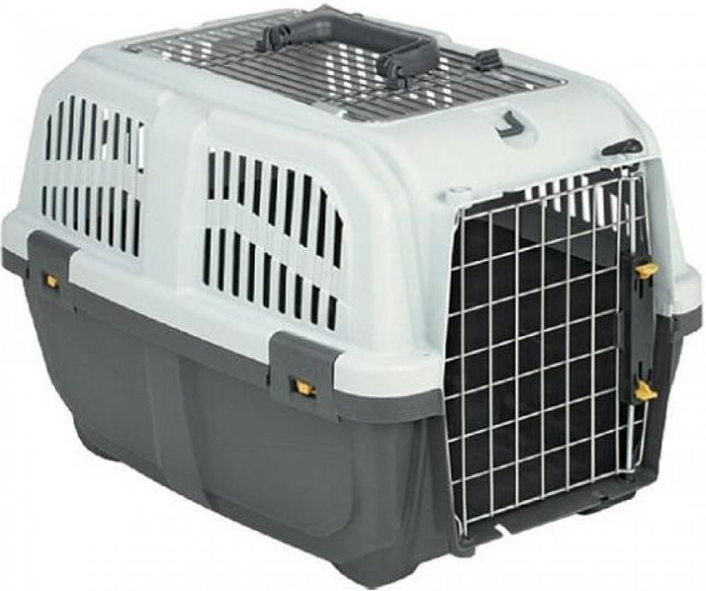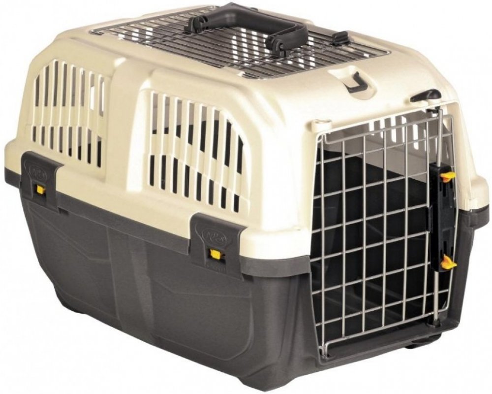 Přepravka Skudo 1 Open pro psy a kočky má masivní pohodlnou rukojeť, kovová dvířka s bezpečnostním zavíráním, praktické úchyty na pás k nošení přes rameno a ve vrchní části mřížku, která umožňuje uklidňující kontakt se zvířetem.