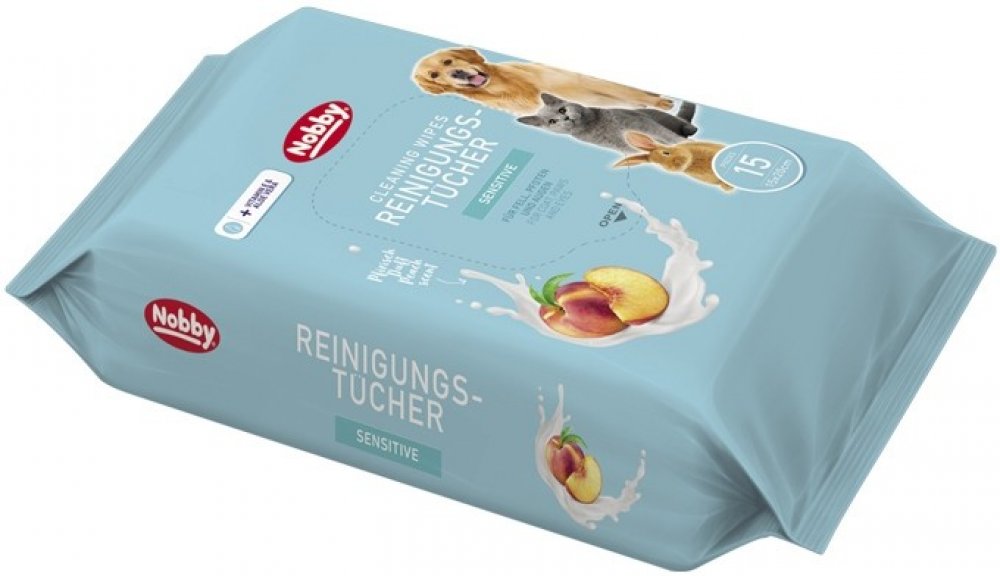 Šetrné vlhčené ubrousky Nobby pro psy a kočky. S jemnou vůní broskví. Obzvláště jemné díky vitamínu E a extraktu AloeVera.