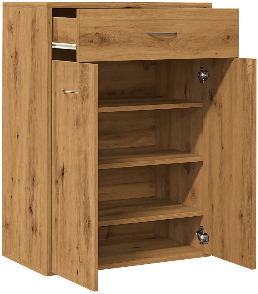 Moderní botník v barvě dub artisan je praktickým a elegantním řešením pro vaši předsíň. Vyrobený z kvalitního kompozitního dřeva, nabízí 4 prostorné police a praktický šuplík navíc, takže poskytne dostatek místa nejen pro boty, ale i pro drobné doplňky, klíče či čisticí prostředky.