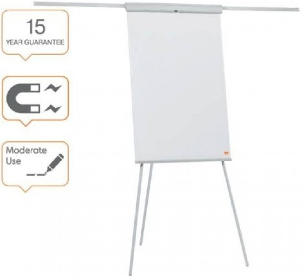 Flipchart s ocelovou magnetickou tabulí stíratelnou za sucha, upevněnou na trojnožce, s integrovanou policí fixy a dvěma výsuvnými rameny, užitečný, když potřebujete zobrazit další stránky. Nohy stativu jsou výškově nastavitelné až do 188 cm a jsou plně zasunutelné pro skladování nebo přepravu. Sada obsahuje háčky na bloky Nobo a proužek pro usnadnění odtrhávání stránek ze zavěšeného bloku. Ocelový magnetický povrch desky zajišťuje vysokou odolnost proti oděru při mírném používání.