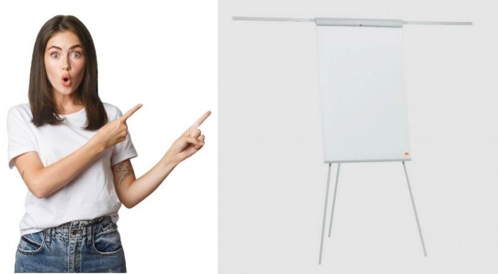 Flipchart s integrovanou policí na fixy a dvěma výsuvnými rameny, užitečnými, když potřebujete ukázat další stránky.