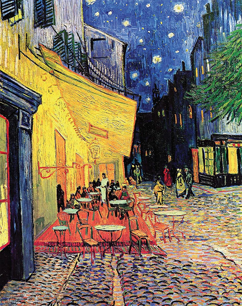Obraz "Noční kavárna", nebo také "Café Terrace at Night" od Vincenta van Gogha, namalovaný v září 1888, je jedním z jeho nejznámějších děl, které zobrazuje venkovní kavárnu na Place du Forum v Arles ve Francii. Obraz zachycuje kavárnu za teplé večerní noci, kdy žluté světlo z lampy osvětluje terasu a vrhá světlo na stolky a hosty sedící venku. Van Gogh použil kontrastní barvy, přičemž zářivé žluté a oranžové tóny osvětlené kavárny ostře kontrastují s hlubokými modrými a fialovými odstíny noční oblohy a okolních budov. Tento kontrast vytváří dynamický a živý obraz, který přitahuje divákův pohled.