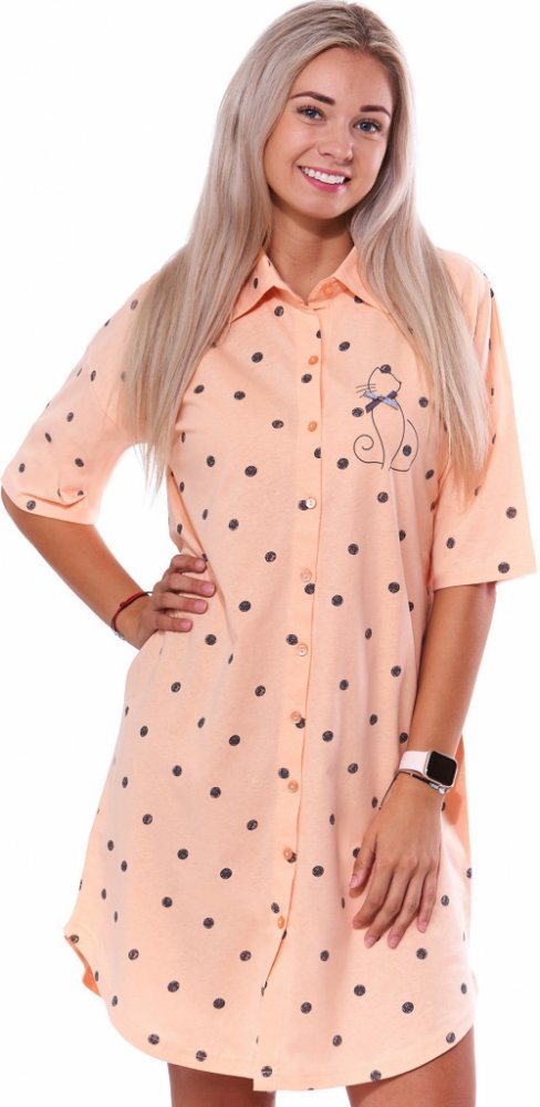 Meruňková a šedě puntíkatá dámská noční košile s límečkem a celopropínací na knoflíky s kočičkou