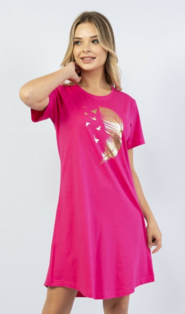 Dámská noční košile, s krátkým rukávem, okrouhlý výstřih, má na přední straně velký potisk - zlaté pírko, s letícími ptáky v pozadí.