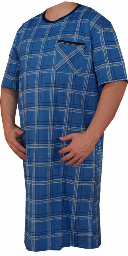 Pánská noční košile barvy modré s krátkým rukávem, je vyrobená z příjemného materiálu - bavlna 100%, košile je velice příjemná na nošení. Košile má na levé horní straně kapsičku. U krku je ukončená výstřihem O.