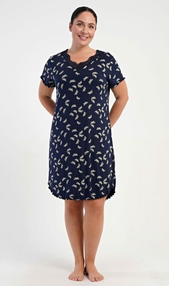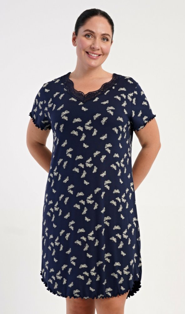 Dámská noční košile s krátkým rukávem Butterflies.Dámská noční košile s krátkým rukávem Butterflies. Noční košile s příjemnou délkou po kolena má žlábkování na rukávech a spodním lemu, výstřih je ozdoben krajkou. Látka košile je potištěna drobnými motýlky. Použitý viskózový materiál s příměsí lycry je příjemný a poddajný na dotek.Pokyny pro údržbu:- 95% viskoza, 5% lycra- lze prát v pračce při tep...