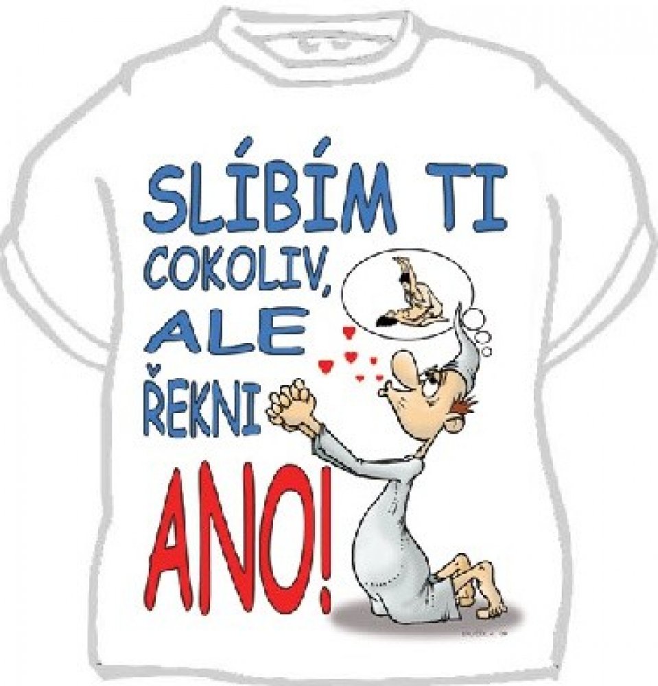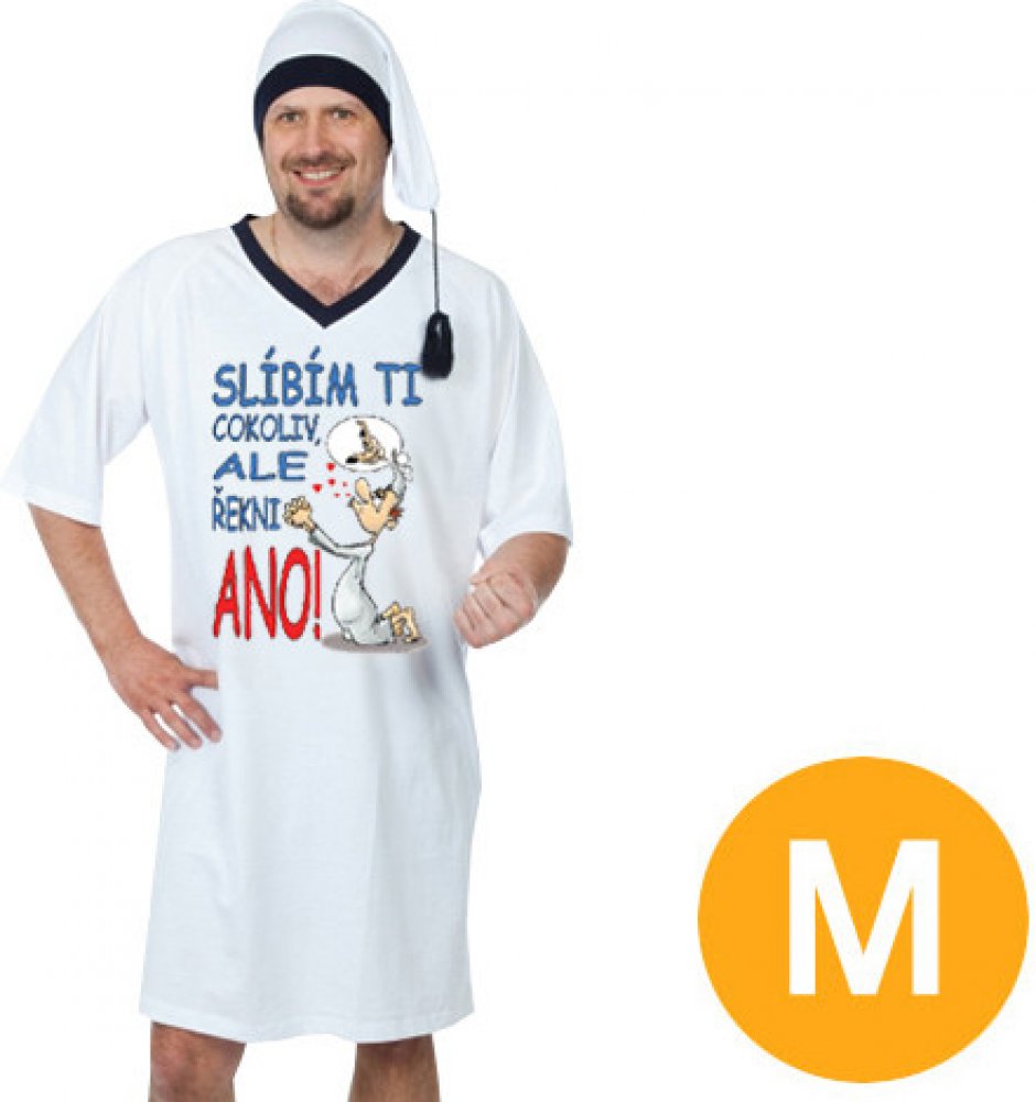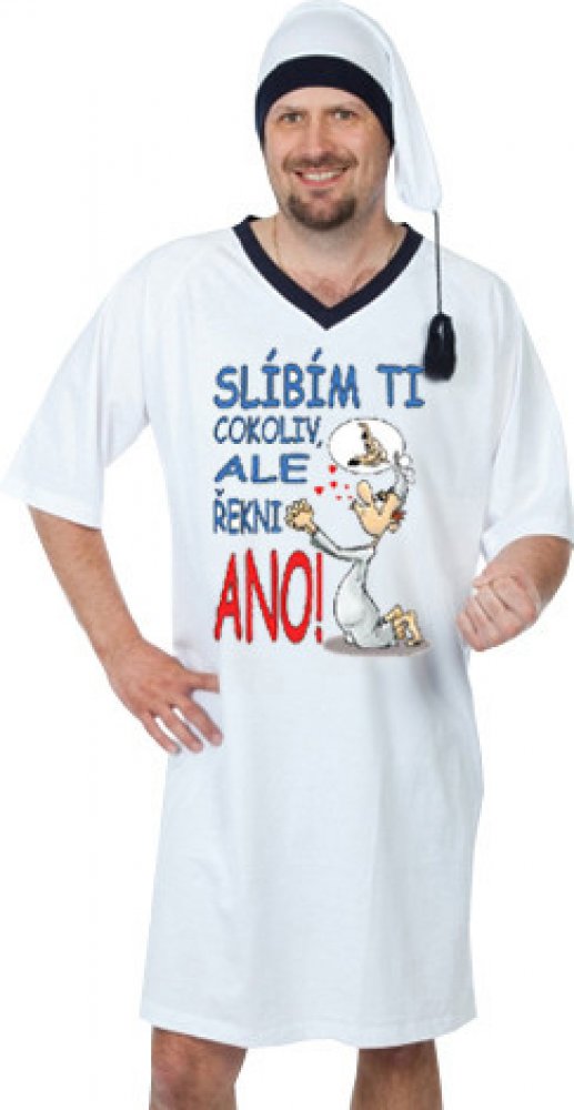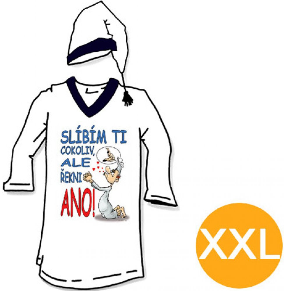 Noční košile Slíbím ti cokoliv - velikost M je kvalitní noční košile s čepicí. Na této vtipné a originální noční košili je obrázek prosícího chlapíka klečícího na zemi (myslícího pouze na jedno...) a vtipný nápis "Slíbím ti cokoliv, ale řekni ANO!" Košile je střední gramáže s kulatým výstřihem. Výstřih, rukávy a dolní lem má dvojité prošití, materiál je příjemný na dotek.