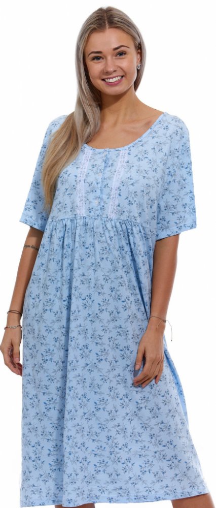 Dlouhá modrá květovaná noční košilka pro ženu na knoflíky s krajkou