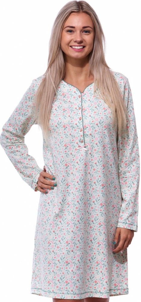 Zelinkavá a růžová květovaná noční košilka s knoflíky u krku pro plnoštíhlé ženy či dívky. Dámská noční košilka s knoflíkovým zapínáním u krku a dlouhými rukávy – perfektní spojení pohodlí a stylu. Vyrobena z příjemného jemného materiálu ze 100% bavlny, který je prodyšný, měkký a šetrný k pokožce. Knoflíkové zapínání u krku dodává košilce elegantní vzhled a praktické využití. Kvalitní zpracování zaručuje dlouhou životnost i po opakovaném praní. Originální design podtrhuje jedinečnost tohoto nočního prádla. Skvělá volba pro ženy, které hledají pohodlnou a elegantní noční košilku na každodenní nošení.