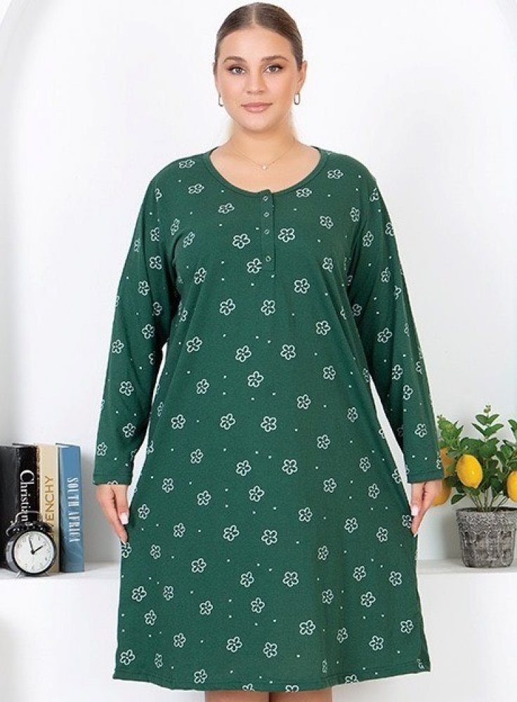 Zelená květovaná noční košilka s dlouhými rukávy na knoflíky u krku pro plnoštíhlé ženy