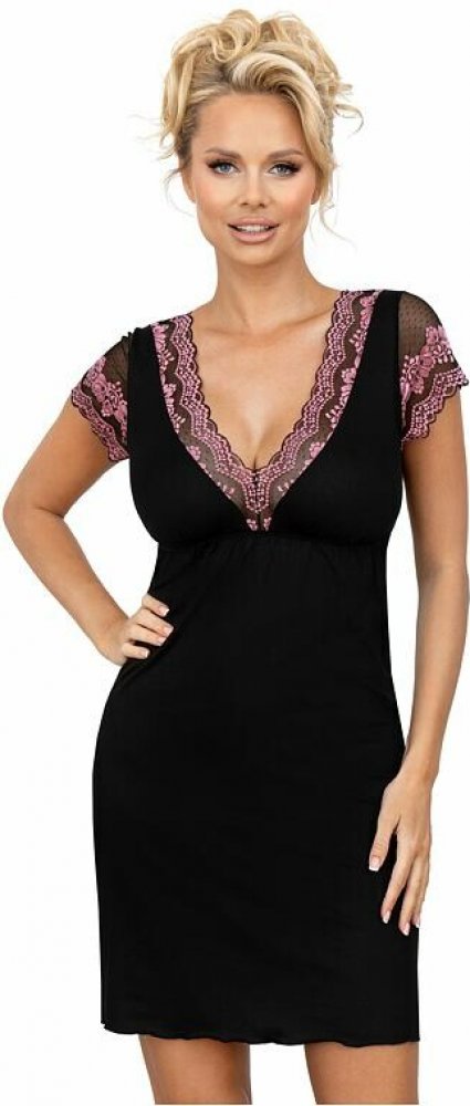 Luxusní dámská košilka Kalina je vyrobená z kvalitní viskózy s příměsí, má elegantní krajkové detaily a působí stylově. Luxusní noční košilka Kalina v černé barvě nabízí kombinaci příjemného materiálu a elegantního designu. Vyrobena je z kvalitní viskózy (90 %) s příměsí elastanu (5 %) a polyamidu (5 %), což zajišťuje pohodlí, měkkost a lehkou pružnost. Košilka má krátkou délku a krátké rukávy. Elegantní výstřih ve tvaru véčka a stylové krajkové detaily podtrhují luxusní vzhled. Materiál je příjemný na dotek, vhodný pro každodenní nošení i speciální příležitosti.Vyrobeno v EU.