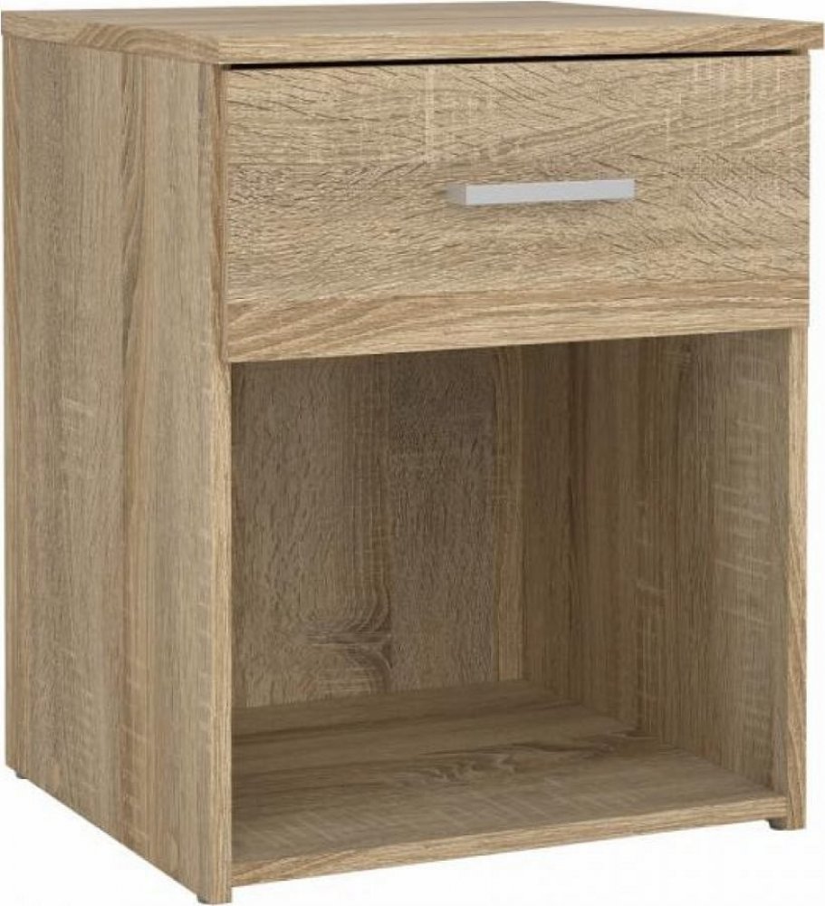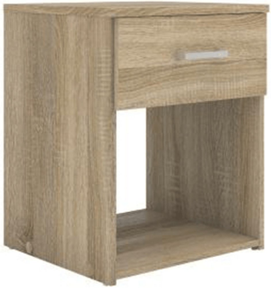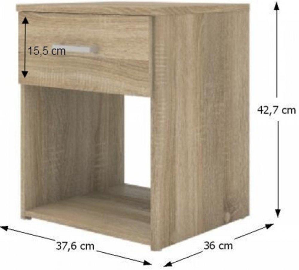 Moderní noční stolek GARBO je stylový a jednoduchý stolek z laminované DTD v barvě dub sonoma. Stůl obsahuje 1 praktickou zásuvku a otevřený prostor pro uložení věcí, které chcete mít vždy po ruce. Zásuvka je doplněna úchytkou v šedé barvě.