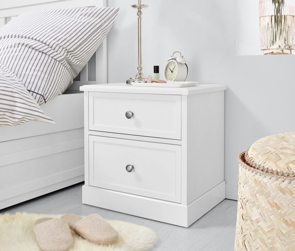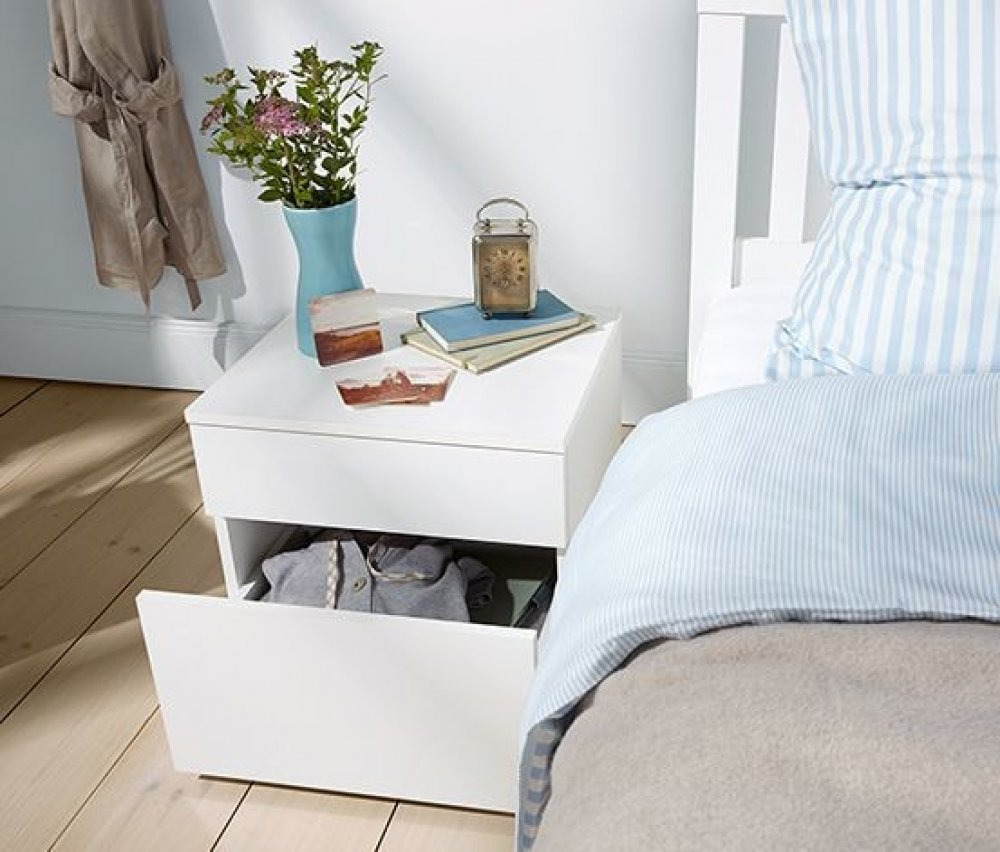 Noční stolek Tento noční stolek s robustními plastovými hranami odolnými proti nárazům je prvkem z naší venkovské série. Zaujme zásuvkami s rámečky a úchyty z matně kartáčovaného kovu. Horní deska je zdobena profilem. Stolek je VYROBEN V NĚMECKU. Stojí na předsestaveném podstavci. Noční stolek se dvěma zásuvkami V tomto nočním stolku má ve dvou zásuvkách s kovovými výsuvy vše své místo, od četby na dobrou noc až po brýle. Barva: Korpus bílý Úchyty matně stříbrné Materiál: Korpus dřevotřísková deska povrchově upravená melaminovou pryskyřicí Čela zásuvek a horní deska MDF Úchyty matně kartáčovaný kov Rozměry: (š x v x h) cca 48,5 x 48,5 x 35,5 cm Nosnost: Zásuvka max. 8 kg Horní deska max. 45 kg Příslušenství: Včetně montážního materiálu a návodu na sestavení Upozornění: Výrobek se dodává rozložený Dodává se v jednom balíku Prvek z naší venkovské série Vrchní deska s profilem Dvě zásuvky s kovovými lištami a s čelem s rámečkem Předsestavený podstavec Robustní plastové hrany odolné proti nárazům – obzvlášť dlouhá životnost VYROBENO V NĚMECKU Testováno na obsah škodlivin – externími akreditovanými ústavy