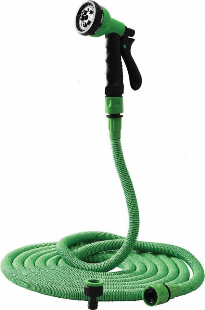 Set se skládá z natahovací hadice a příslušenství. Hadice ja dlouhá 10 metrů, po natažení 30 metrů. Materiál vnitřní hadice: dvojitý latex 6 x 9,5 mm, vnější látka 600 x 600 polyester vysoké pevnosti. Příslušenství: 1 pár konektoru, 1 ks 1/2-3/4“ adaptéru, 1 ks 7-funkční stříkací pistole.