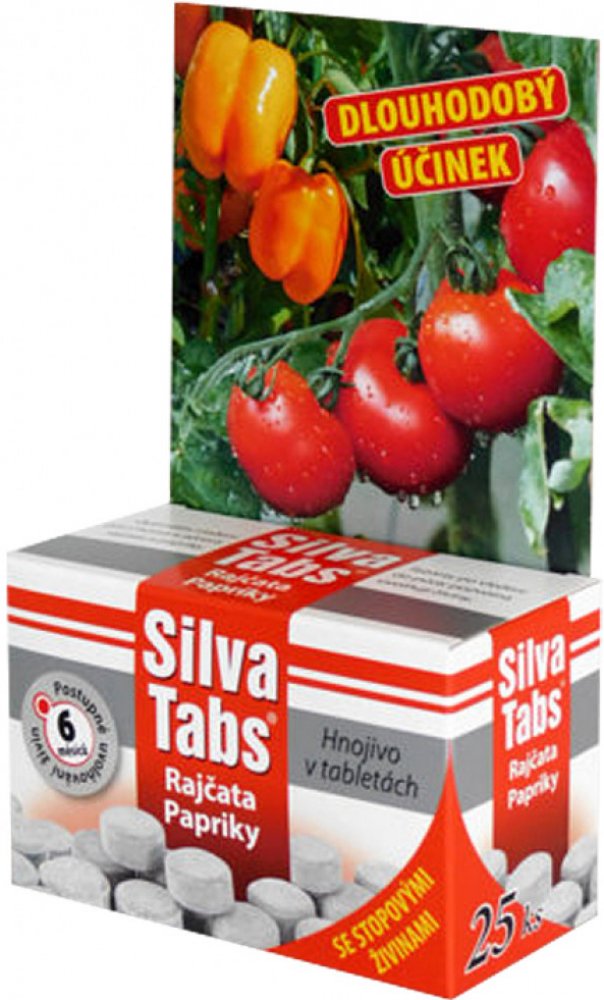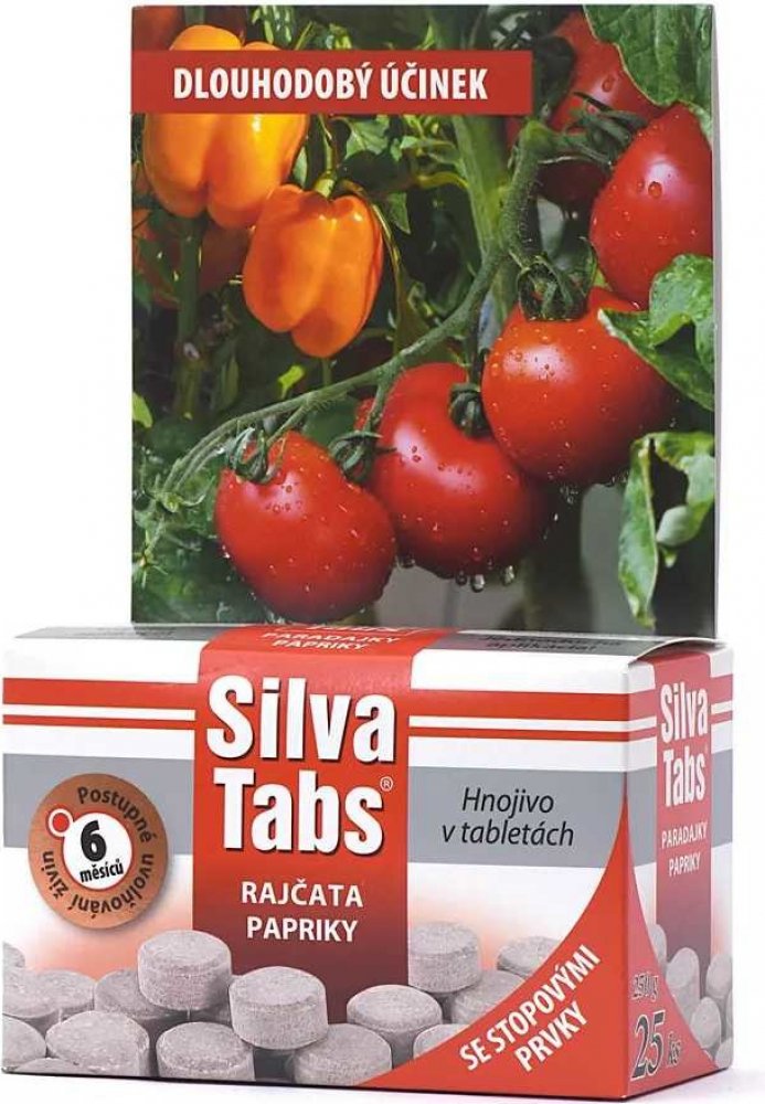 Díky pomalému uvolňování živin z hnojiv Silva Tabs® jsou rostliny zásobovány po dlouhou dobu vší potřebnou výživou, přičemž jsou živiny zároveň využívány beze ztrát. Nehrozí poškození vegetativních částí rostlin (tzv. spálení v důsledku nadbytku hnojiva). Oproti zemědělským hnojivům jsou výrazně šetrnější k životnímu prostředí. Živiny se uvolňují z tablet do půdy po dobu 6 měsíců. Aplikace: tablety se aplikují rovnoměrně kolem kořenového systému rostliny v období výsadby. Zohledněte tablety při obrábění půdy kolem rostlin. Rajčata: 3ks tablet se zapraví do půdy min. 5 cm nad kořenový bal ve vzdálenosti 10 cm od stonku. Papriky: 2ks tablet se zapraví mělko do půdy 5 cm za okraj kořenového balu.