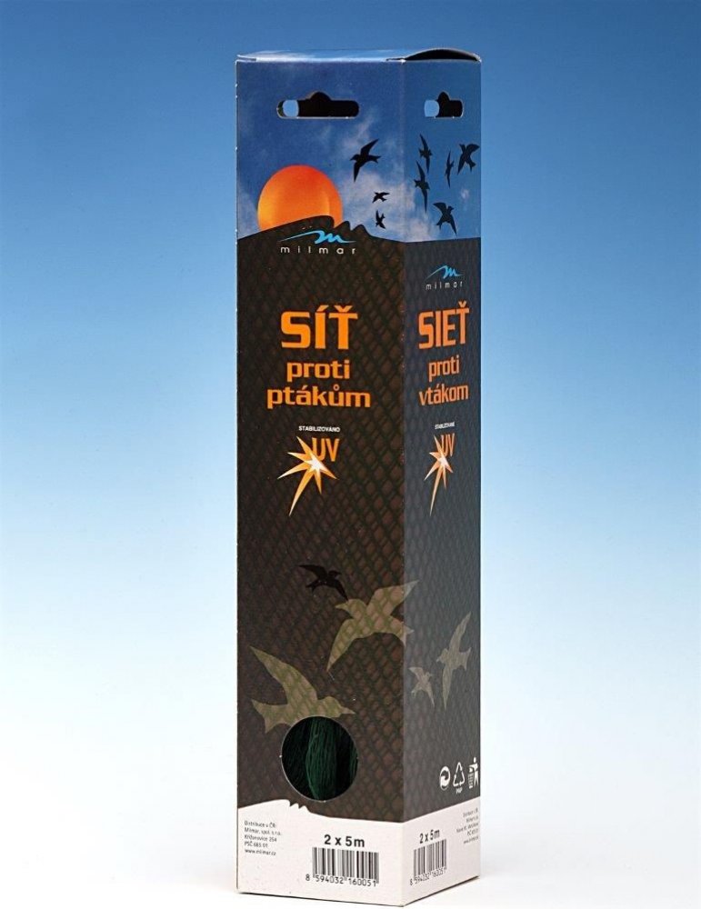 Síť proti ptákům - je ochranná síť, která efektivním způsobem ochraní plody jahod, borůvek, třešní, révy vinné a jiných sladkých plodů před náletem ptactva. Dále se může využítí k ochraně zahradních jezírek s okrasnými rybami. Síť na ptáky nebrání přístupu vzduchu, světla ani tepla. Ochranná síť proti ptactvu má UV stabilizaci pro víceleté použití a vysokou odolnost proti protržení. Síť je vyrob...
