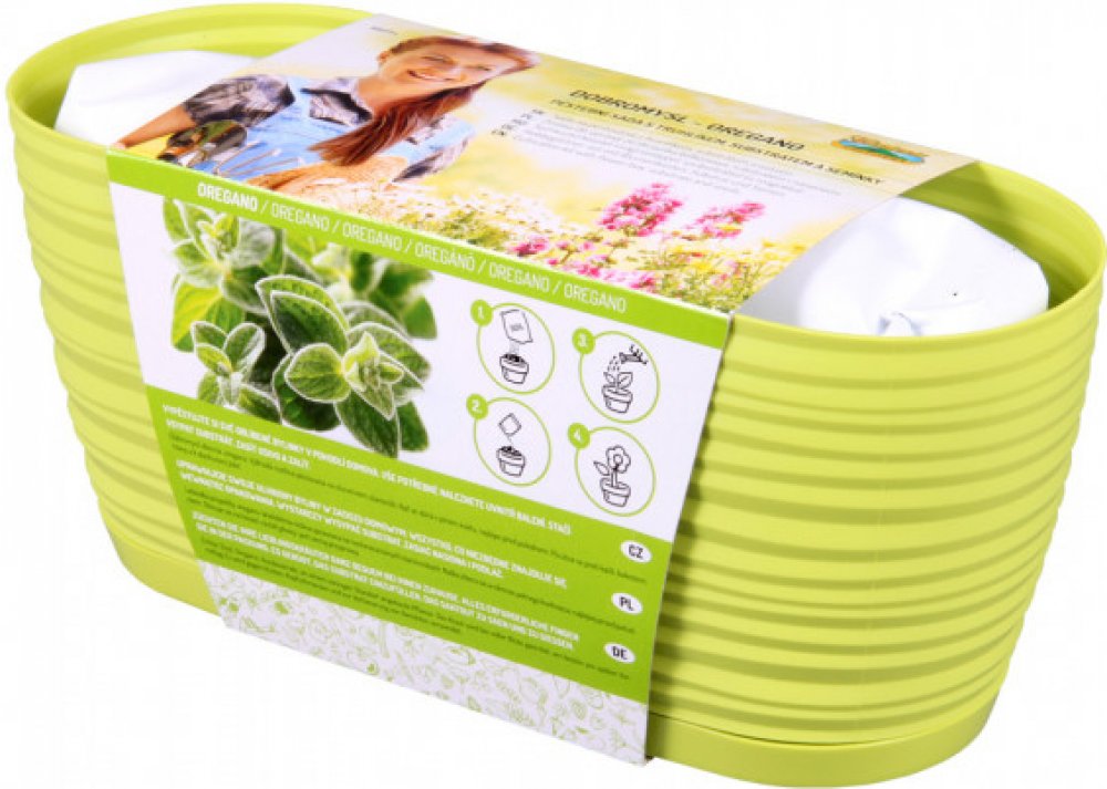 Balení obsahuje: 2,5 kg substrátu, 1x osivo oregána, 1x 27 cm plastový truhlík.