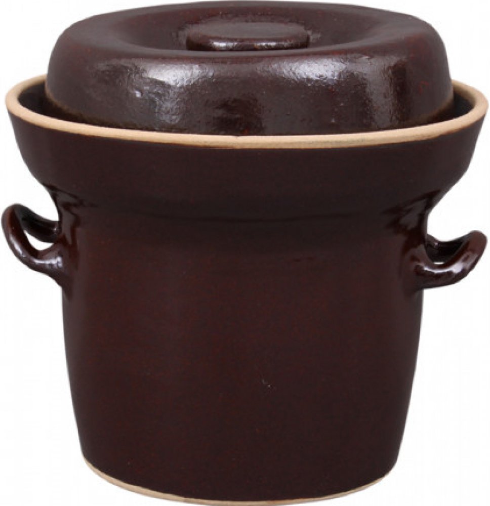 \nKeramický glazovaný hnědý lesklý 2 l zelák s víkem. Zelák má téměř tvar válce, který se u hrdla rozevírá, aby se dal pohodlně zavřít víkem. Pod hrdlem jsou kvůli lepší manipulaci přidělaná keramická