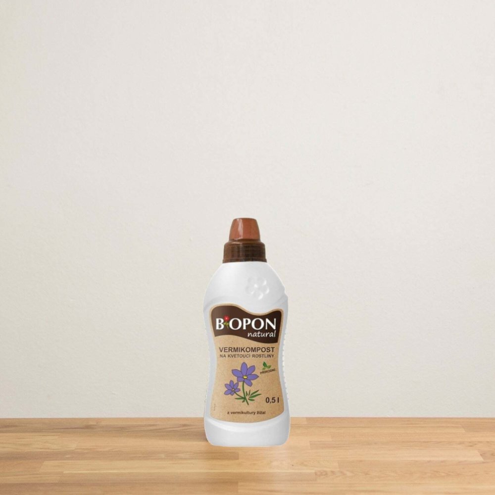 Natural Vermikompost pro kvetoucí rostliny, 100 % přírodní, kapalný produkt vyrobený z vermikompostu, zlepšující vlastnosti půdy a obohacující půdu o živiny. Je určený k pěstování všech kvetoucích rostlin pěstovaných doma, na balkóně a na zahradě. Vyrábí se z vermikastů žížal, které ho při trávení půdy nasytí užitečnými mikroorganismy, které uvolňují živiny vázané v půdě. Výrobek zlepšuje vlastnosti půdy, zvyšuje její schopnost zadržovat vodu a omezuje vyluhování živin. Dále stimuluje biologický život v půdě a poskytuje optimální podmínky pro vývoj rostlin. Při pravidelném použití Vermikompost pro kvetoucí rostliny poskytuje rostlinám správnou výživu, bohaté a dlouhotrvající kvetení a krásnou barvu květů.