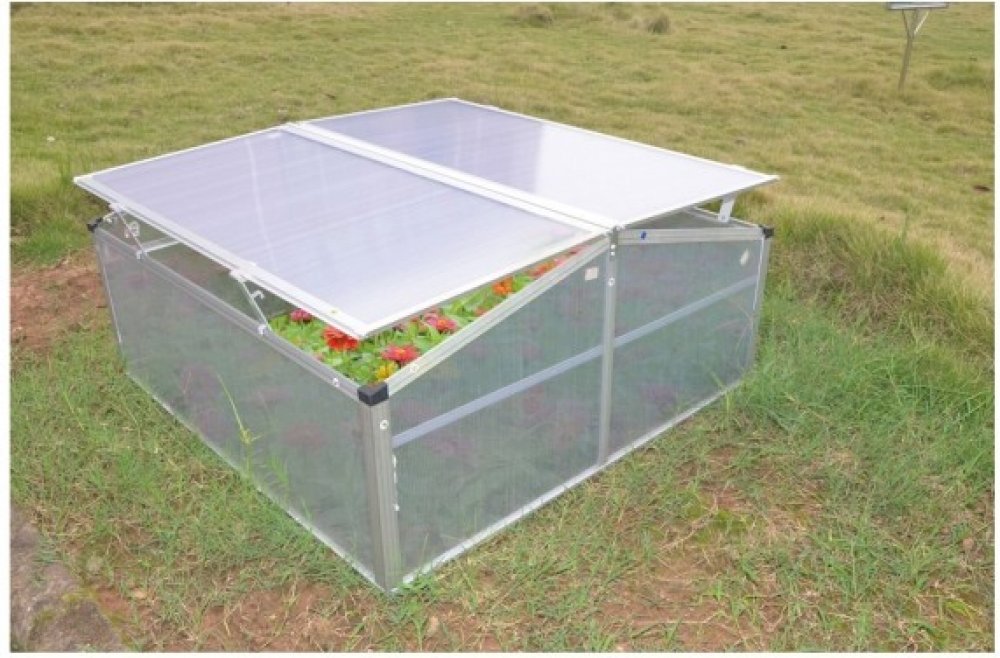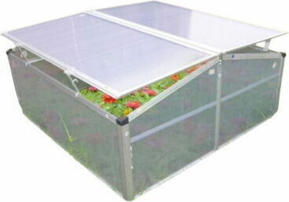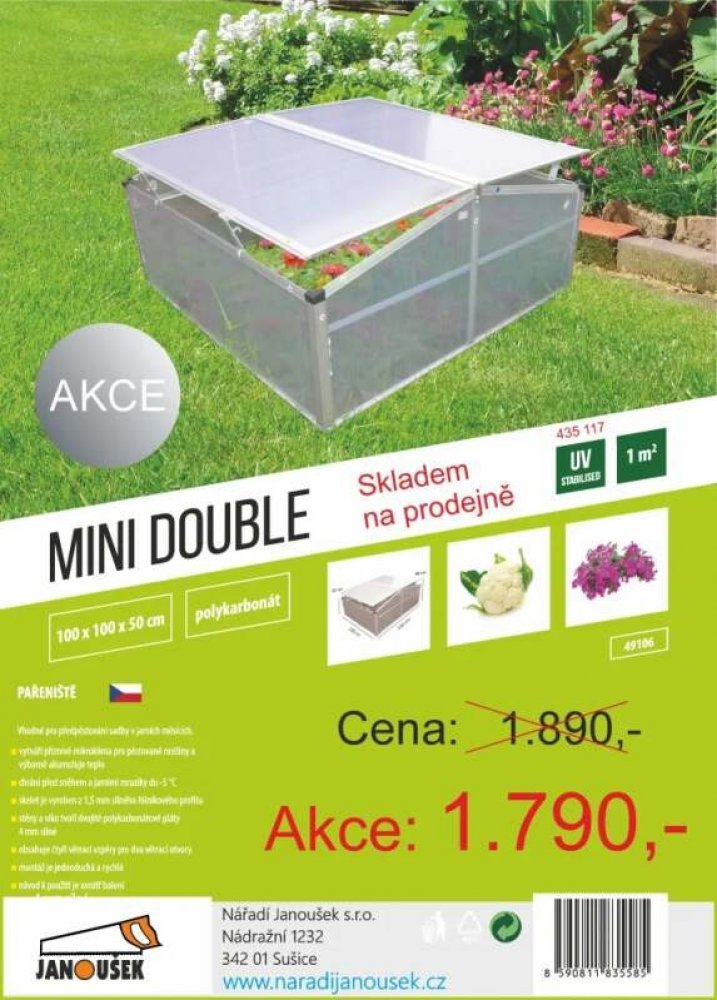 Polykarbonátový skleník pro vytvoření příznivého mikroklima. Síla hliníkového rámu: 1,5 mm. Stěny a strop tvoří dvojité polykarbonátové pláty s UV ochranu. Obsahuje 2 kovové police v bílé barvě. Základna je kovová, pozinkovaná. Výška nižší stěny: 40 cm, vyšší: 50 cm. Pařeniště z polykarbonátu - 2 křídla, rozměry 50 × 100 × 100 cm (V׊×D) Pařeniště NG Mini Double polykarbonát 100 x 100 x 48/35 cm