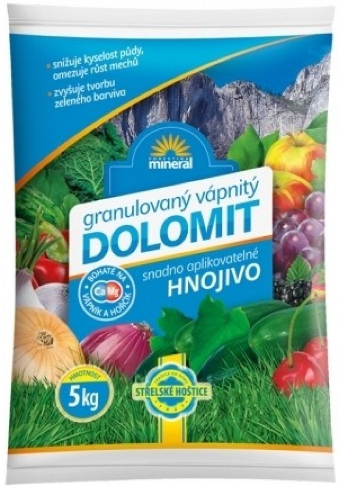 NG 1442 Vápenec dolomitický MINERAL 5kg 350x230x70Přírodní hnojivo s vysokým obsahem vápníku, hořčíku a stopových prvků vhodné pro podzimní a jarní základní hnojení. Bohatý obsah vápníku zaručuje dobré vyzrávání plodů a zlepšuje jejich skladovatelnost. Velký podíl hořčíku zvyšuje produktivitu růstu. Díky svému složení je hnojivo velmi vhodné pro pěstování BIO zeleniny a ovoce. Působí rychle a dlou...