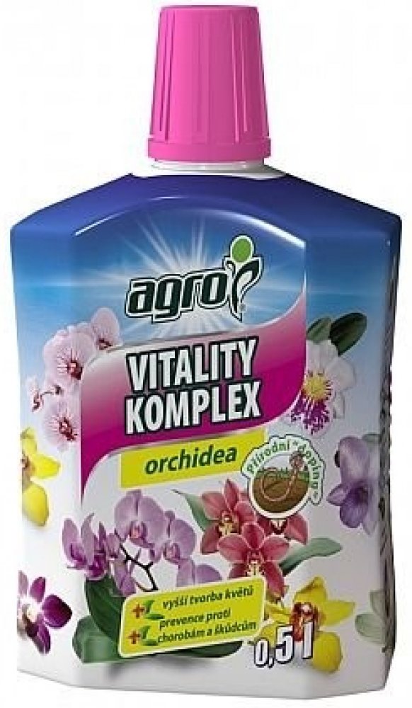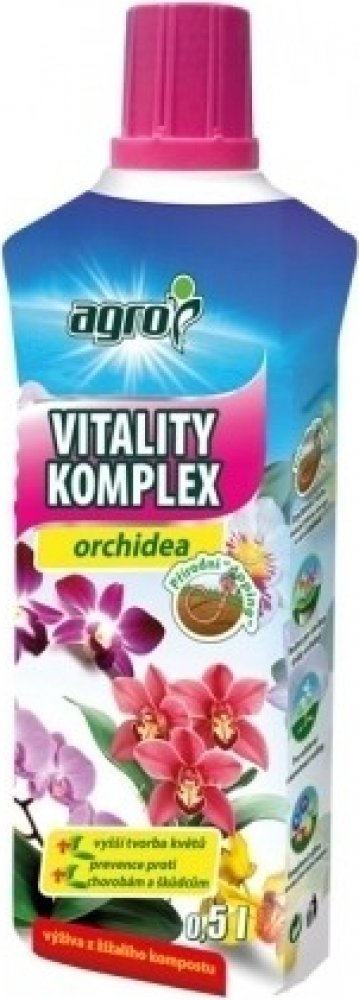 NG 2413_CCR Výživa AGRO VITALITY KOMPLEX na orchideje 500ml 60x97x164Kapalný pomocný přípravek určený k zálivce i k postřiku na list pro všechny druhy běžně pěstovaných orchidejí. Obsahuje vyšší dávky urychlovače růstu. Složení: speciální výluh z vermikompostu (vyvážený poměr živin a mikroprvků). Působí regeneračně při poškození chorobami a škůdci, zvyšuje odolnost proti stresu, podporuje růst, kv...