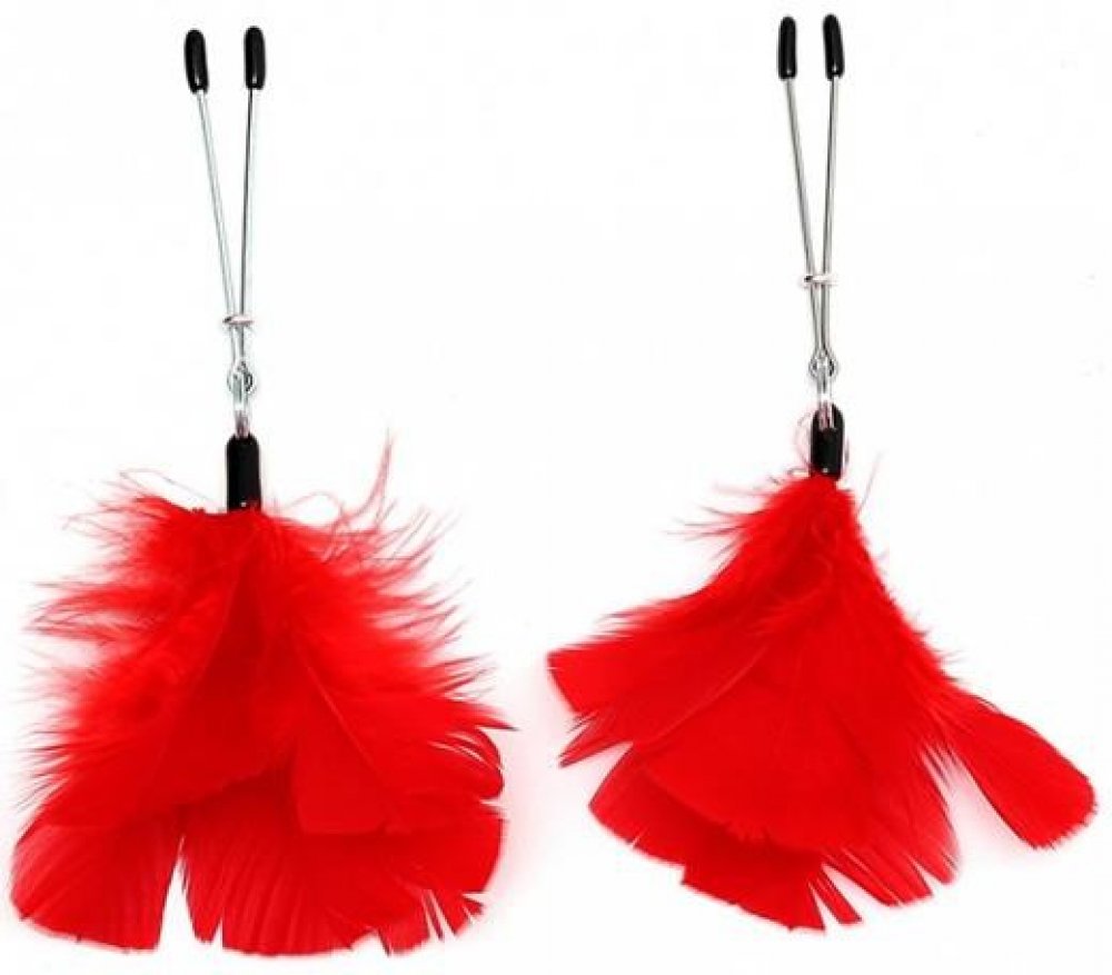 Tlak svorek je regulován bočním knoflíkem. Tímto způsobem můžete udržovat uspokojivou upínací sílu, která vás zavede na vrchol vaší blaženosti neustálým lechtáním a škádlením hořících bradavek.Zakončení smyslným peřím vám dodá jedinečné kouzlo a povede k horečce vašeho partnera.S jejich pomocí můžete také jemně pohladit tělo svého milence a poskytnout mu neuvěřitelně intenzivní pocit.Svorky lze použít i na jiné části těla.SPECIFIKACE:Barva: červená, černá, bílá, růžová, fialováTyp: Sada 2 svorek na bradavkyMateriál: kovové a pryžové části, falešné peříCelková délka: 12 cmDélka svorky: 5 cmBaleno v PVC obalu