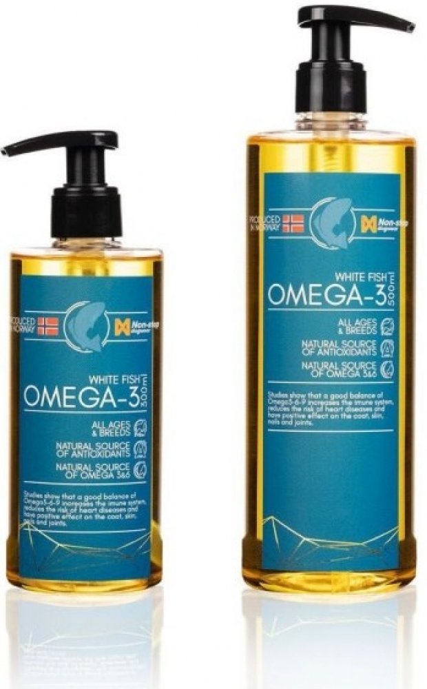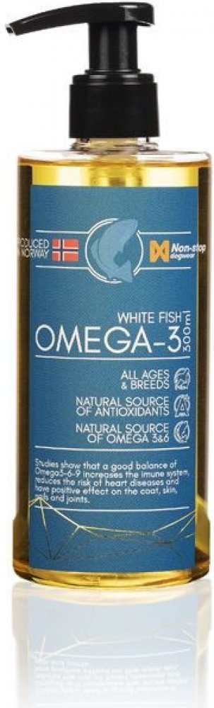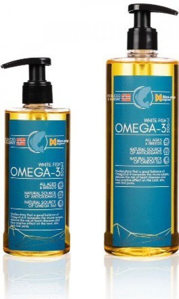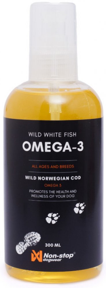 Non-stop dogwear White Fish Omega-3 je 100% čistý olej pro psy z hlubokomořských bílých ryb, bez aditiv. Tento olej jsme vybrali schválně pro jeho vysoký obsah omega-3 nenasycených mastných kyselin, zvláště pak EPA a DHA. Obsah omega-3 v rybách (a olejích z ryb) záleží na tom, co ryba jí, neboť sama jich produkuje jen velmi malé množství. Bílé hlubokomořské ryby přirozené obsahují mnohem více omega-3 nenasycených MK než červené ryby (typicky losos). Další výhodou oleje z bílých ryb je, že nezabravuje psí srst tak, jak to často vídáme u psů krmených lososovým olejem. Olej je zpracovaný a testovaný v Norsku, abychom měli jistotu, že je čerstvý.
