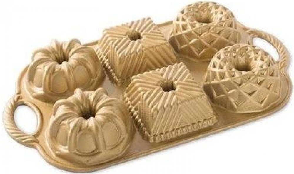 Zlatá forma na mini dortíky nebo mini bábovky ve třech tvarech od špičkové americké značky Nordic Ware je vyrobena z vysoce kvalitního a odolného litého hliníku s nepřilnavou vrstvou, který má dlouhou životnost a je zdravotně nezávadný.