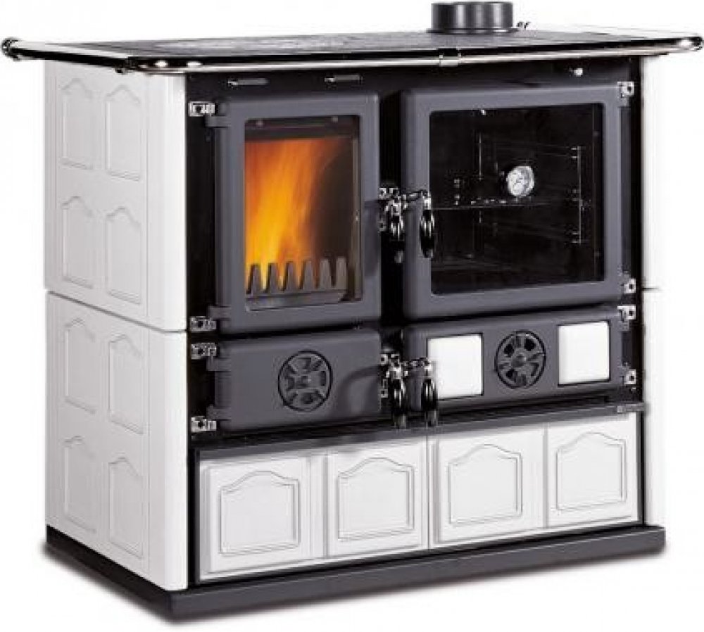 Rosa Maiolica 4.0, Nordica - Litinový sporák na topení dřevem a dřevěnými briketami s proskleným ohništěm a masivním kachlovým obkladem, který zvyšuje jeho akumulační schopnost. Konstrukce topeniště je masivní celolitinová a veškeré ocelové díly jsou smaltované z obou stran nebo pozinkované, což zaručuje dlouhodobou životnost sporáku. Veškerá dvířka jsou také z masivní litiny. Parametry: