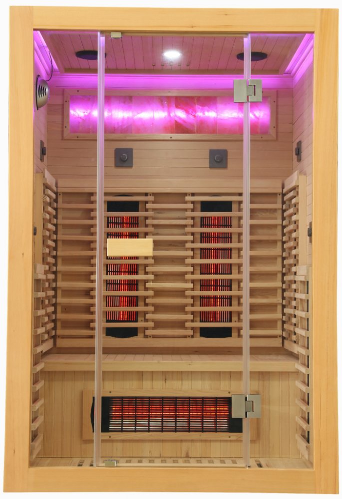 Solná terapie - panely himalájské soli zabudované ve stěně infrasauny působí příznivě na dýchací cesty a zlepšují kvalitu pokožky. Navíc po zapnutí jejího podsvícení Vás nadchne a evokuje onyxové stěny v luxusních domech