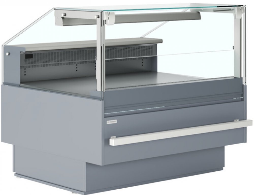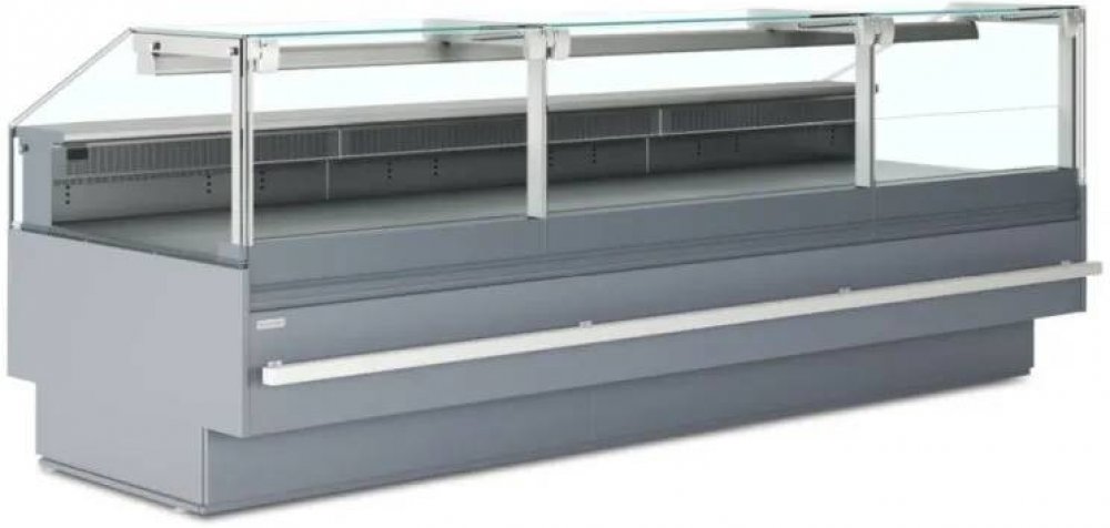Chladicí vitrína obslužná ventilovaná s agregátem a čelním rovným zvedacím sklem s tlumiči. Vitrína s extra velkou výstavní plochou.Na objednávku: