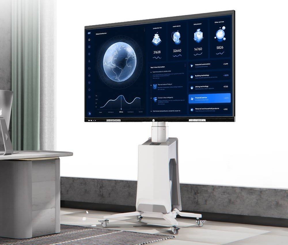 Kvalitní stojan na televizi nebo monitor s úhlopříčkou 55" až 80" s elektrickým výškovým polohováním v rozmezí 1200 až 1500mm a krásném bílém provedení. Nastavení výšky je možné pomocí ovládacího panelu na stojanu a má možnost uložit 3 výšky do paměti. Stojan podporuje VESA standardy 200x200 až 600x400 a zavěsit můžete veškeré televize, monitory, displeje nebo panely s hmotností do 45,5 kg (včetně). Stojan je v profesionální kvalitě a v opravdu krásném bílém provedení, důraz byl kladen na každý detail - systém pro vedení kabeláže, dětská pojistka, kvalitní kolečka s aretací, materiály, displej s aktuální výškou, snadné ovládání. Na stojan poskytujeme záruku 3 roky. Dopravné je zdarma.