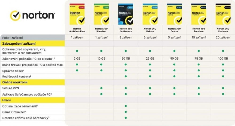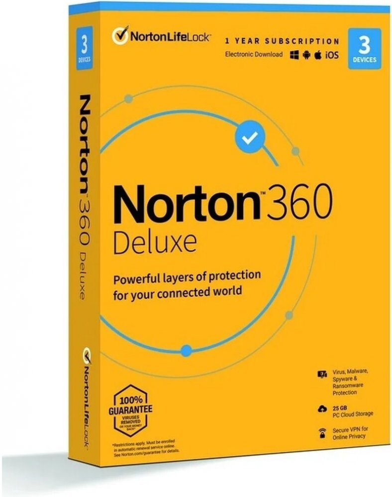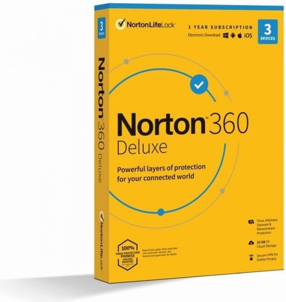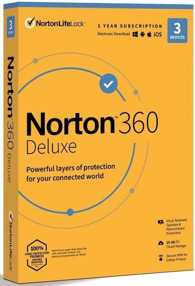 NORTON 360 DELUXE 25GB +VPN 1 uživatel pro 3 zařízení na 1rok Elektronická licence Norton 360 Deluxe poskytuje komplexní ochranu před malwarem až pro 3 počítačů PC, počítačů Mac, zařízení se systémem Android nebo iOS, plus funkci rodičovské kontroly, která pomáhá chránit vaše děti online, správce hesel pro ukládání a správu hesel a funkci zálohování PC do cloudu. Norton 360 Deluxe zahrnuje také síť VPN pro 3 zařízení a aplikaci ochrana kamery před zneužitím pro počítače PC. Určeno pro nové uživatele i k obnově licencí stávajících uživatelů Klíčové vlastnosti bezpečnostního software Norton 360 Nová licence i Obnova elektronické licence pro stávající uživatele Licence je určena pro 3 zařízení na 12 měsíců Ochrana pro PC, notebook, mobil nebo tablet (Windows, Mac, Android) Ochrana před hrozbami v reálném čase Brána firewall pro počítač PC a Mac. Ochrana identity a transakcí online Rodičovská kontrola Zálohování PC s Win do cloudu Šifrovaný přenos dat přes Secure VPN Ochrana webové kamery SafeCam Ochrana před hrozbami v reálném čase Pokročilé zabezpečení pomocí antivirového programu chrání vaše zařízení před existujícími a novými online hrozbami a pomáhá chránit vaše osobní a finanční údaje, když se připojíte k internetu. Secure VPN Procházejte internet anonymně a bezpečněji pomocí virtuální privátní sítě (VPN), která nevytváří protokoly. Přidejte šifrování na bankovní úrovni, které zajistí, že vaše informace, například hesla a údaje o bankovních účtech, zůstanou důvěrné a v bezpečí. Inteligentní brána firewall pro počítač PC nebo brána firewall pro počítač Mac Sleduje komunikaci mezi vaším počítačem a ostatními počítači a blokuje neoprávněný provoz. Rodičovská kontrola Spravujte aktivity svých dětí na internetu. Pomozte jim bezpečně objevovat, poznávat a využívat možnosti digitálního světa z jejich počítačů PC a chytrých telefonů. Funkce Rodičovská kontrola Norton nejsou podporovány na počítači Mac. Správce hesel Nástroje, které snadno generují, ukládají a spravují hesla, informace o platebních kartách a další online přihlašovací údaje – bezpečněji. Zálohování počítače PC do cloudu s kapacitou 25 GB Ukládejte důležité soubory a dokumenty jako preventivní opatření proti ztrátě dat kvůli selhání pevného disku, krádeži zařízení, nebo dokonce kvůli ransomwaru.Funkce aplikace Norton Cloud Backup jsou k dispozici pouze v systému Windows. SafeCam pro počítače PC Okamžitě vás upozorní na pokusy o přístup k webové kameře a pomůže vám neoprávněný přístup zablokovat.Funkce Norton SafeCam jsou k dispozici pouze v systému Windows..