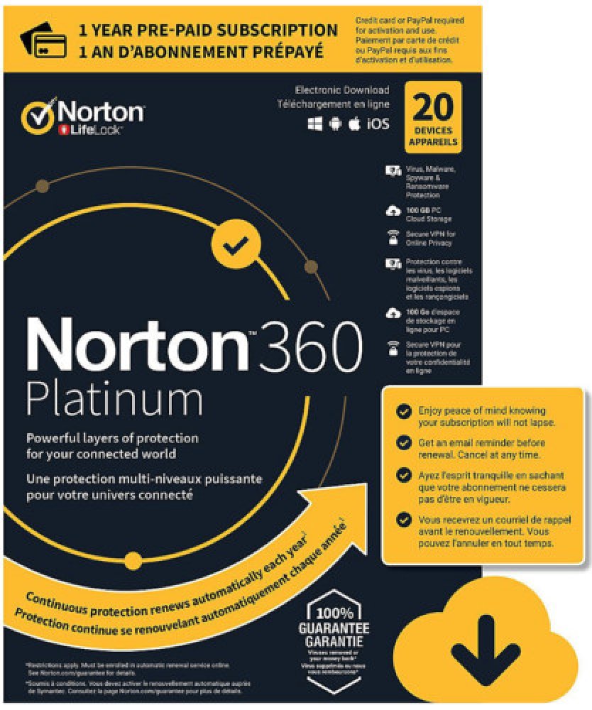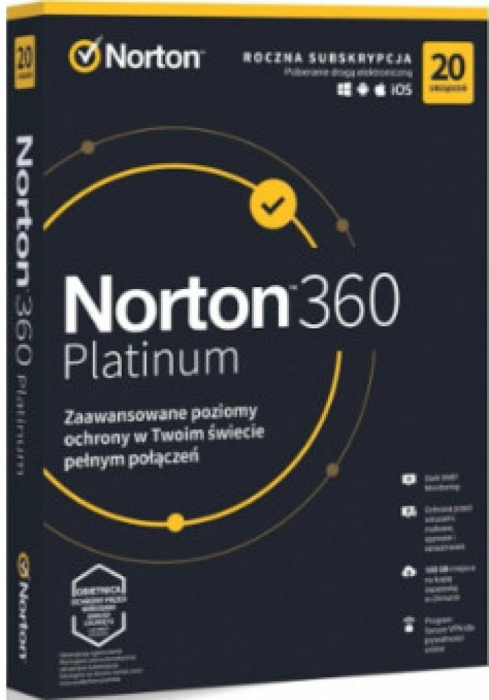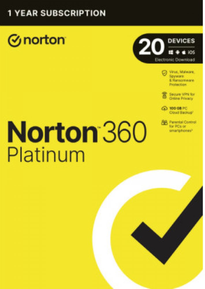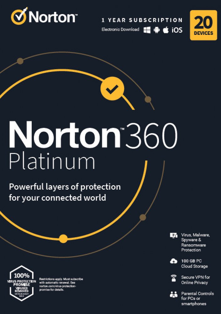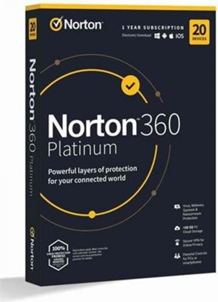 Norton 360 PLATINUM 100GB +VPN 1 uživatel pro 20 zařízení na 1rok Elektronická licence Norton 360 Platinum poskytuje komplexní ochranu před malwarem až pro 20 počítačů PC, počítačů Mac, zařízení se systémem Android nebo iOS, plus funkci rodičovské kontroly, která pomáhá chránit vaše děti online, správce hesel pro ukládání a správu hesel a funkci zálohování PC do cloudu. Norton 360 Platinum zahrnuje také síť VPN pro 10 zařízení a aplikaci ochrana kamery před zneužitím pro počítače PC. Určeno pro nové uživatele i k obnově licencí stávajících uživatelů. Klíčové vlastnosti bezpečnostního software Norton 360 Nová licence i Obnova elektronické licence pro stávající uživatele Licence je určena pro 20 zařízení na 12 měsíců Ochrana pro PC, notebook, mobil nebo tablet (Windows, Mac, Android) Ochrana před hrozbami v reálném čase Brána firewall pro počítač PC a Mac. Ochrana identity a transakcí online Rodičovská kontrola Zálohování PC s Win do cloudu Šifrovaný přenos dat přes Secure VPN Ochrana webové kamery SafeCam Ochrana před hrozbami v reálném čase Pokročilé zabezpečení pomocí antivirového programu chrání vaše zařízení před existujícími a novými online hrozbami a pomáhá chránit vaše osobní a finanční údaje, když se připojíte k internetu. Secure VPN Procházejte internet anonymně a bezpečněji pomocí virtuální privátní sítě (VPN), která nevytváří protokoly. Přidejte šifrování na bankovní úrovni, které zajistí, že vaše informace, například hesla a údaje o bankovních účtech, zůstanou důvěrné a v bezpečí. Inteligentní brána firewall pro počítač PC nebo brána firewall pro počítač Mac Sleduje komunikaci mezi vaším počítačem a ostatními počítači a blokuje neoprávněný provoz. Rodičovská kontrola Spravujte aktivity svých dětí na internetu. Pomozte jim bezpečně objevovat, poznávat a využívat možnosti digitálního světa z jejich počítačů PC a chytrých telefonů. Funkce Rodičovská kontrola Norton nejsou podporovány na počítači Mac. Správce hesel Nástroje, které snadno generují, ukládají a spravují hesla, informace o platebních kartách a další online přihlašovací údaje – bezpečněji. Zálohování počítače PC do cloudu s kapacitou 100 GB Ukládejte důležité soubory a dokumenty jako preventivní opatření proti ztrátě dat kvůli selhání pevného disku, krádeži zařízení, nebo dokonce kvůli ransomwaru. Funkce aplikace Norton Cloud Backup jsou k dispozici pouze v systému Windows. SafeCam pro počítače PC Okamžitě vás upozorní na pokusy o přístup k webové kameře a pomůže vám neoprávněný přístup zablokovat.Funkce Norton SafeCam jsou k dispozici pouze v systému Windows..