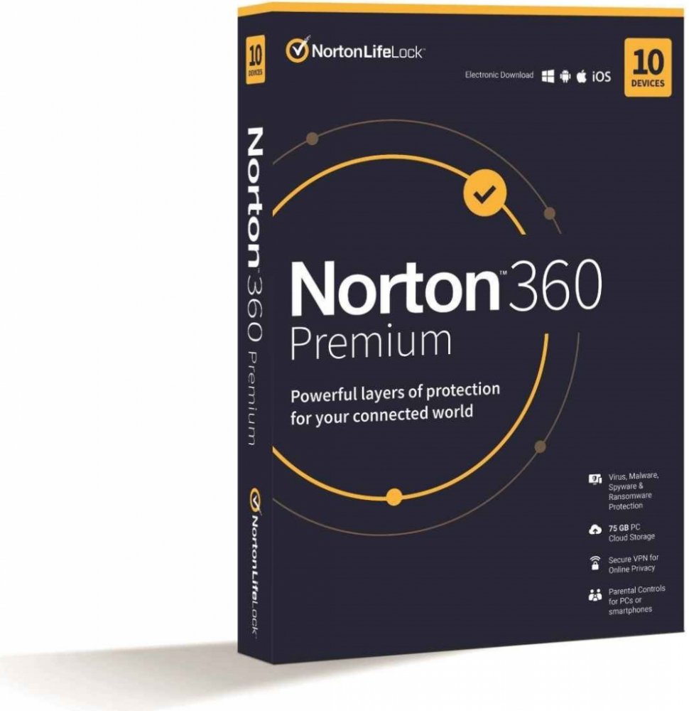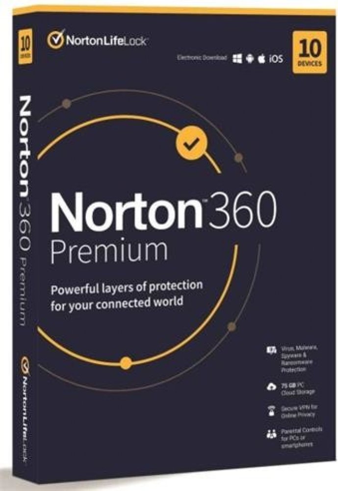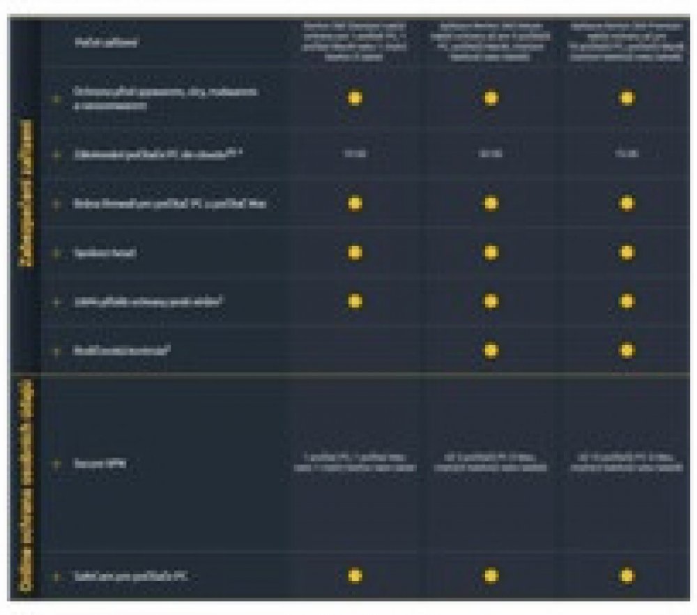 Norton 360 Premium poskytuje komplexní ochranu před malwarem až pro 10 počítačů PC, počítačů Mac, zařízení se systémem Android nebo iOS, plus funkci rodičovské kontroly‡, která pomáhá chránit vaše děti online, správce hesel pro ukládání a správu hesel a funkci zálohování PC do cloudu4. Norton 360 Premium zahrnuje také síť VPN pro 10 zařízení a aplikaci SafeCam pro počítače PC. Aplikace Secure VPN vám umožňuje bezpečnější anonymnější procházení webu, a to i ve veřejných sítích Wi-Fi, aplikace SafeCam5 upozorňuje na apomáhá blokovat neoprávněný přístup k webové kameře na vašem počítači PC.