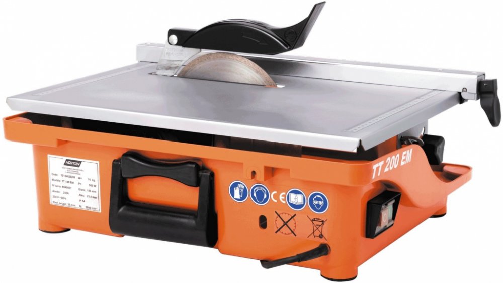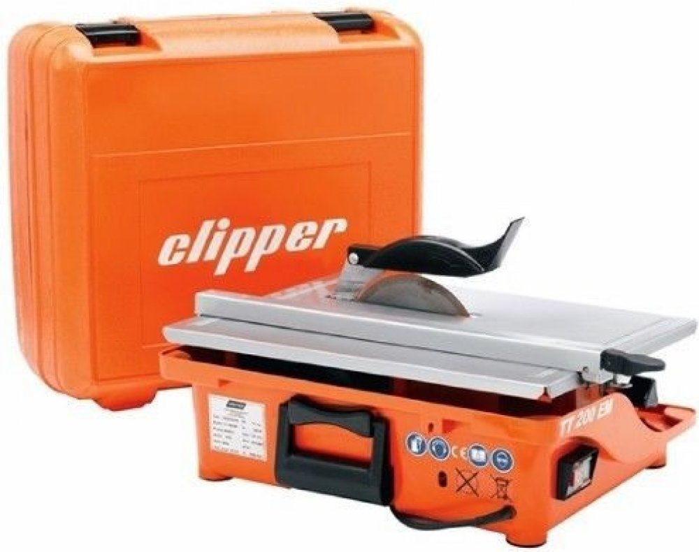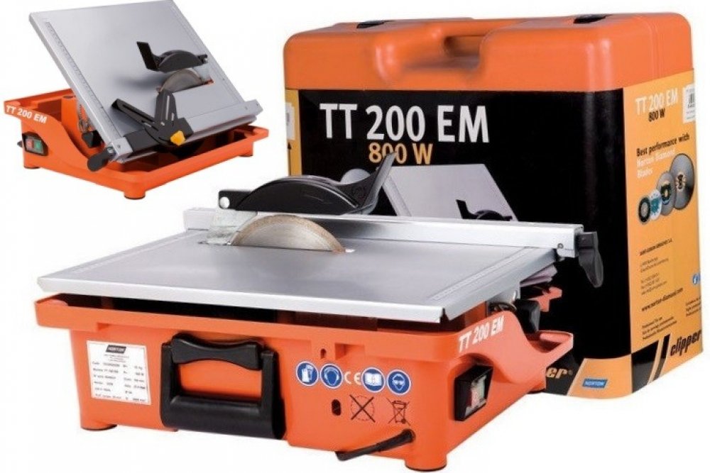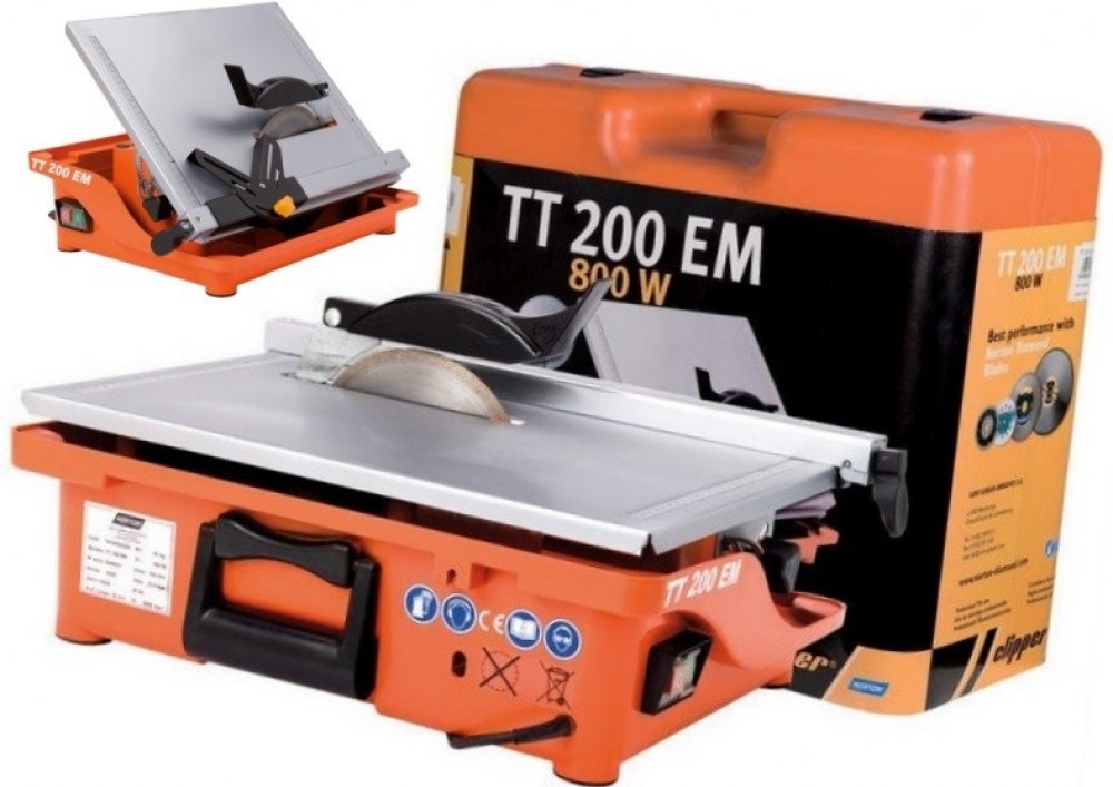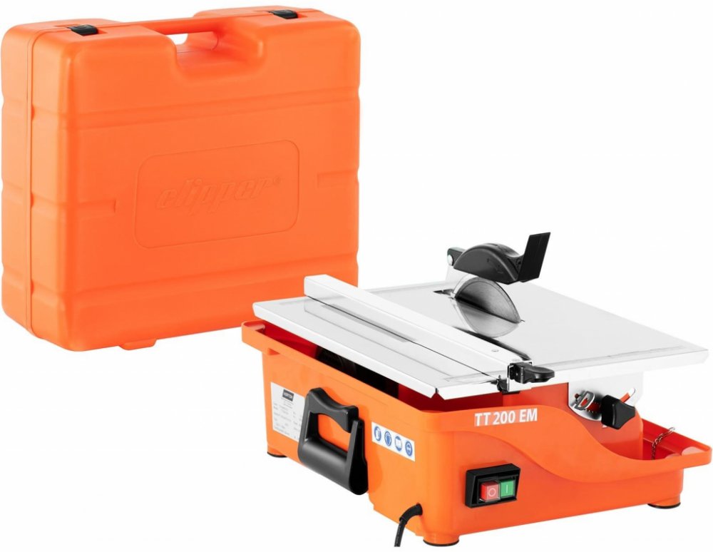 Pila TT200EM má dlouhou životnost a vysoký výkon jak při operacích za mokra, tak I za sucha a je určena pro širokou škálu různých druhů dlaždic. Pila TT200EM má dlouhou životnost a vysoký výkon jak při operacích za mokra, tak I za sucha a je určena pro širokou škálu různých druhů dlaždic. Tak jako u jiných strojů Clipper, uživatel okamžitě ocení důraz kladený na detaily a kvalitu materiálu použitého ke konstrukci pily. Pila a její náhradní díly odpovídají vsokým standardům, které zajišťují dlouhou životnost a minimální údržbu. Účel použití Stroj je navržen k řezání široké škály dlaždic. Není určen k řezání dřeva nebo kovu. Rám Rám je vyroben z pevného plastu, který zajišťuje perfektní stabilitu. Podpírá motor, řezací plochu a spínač. Řezací plocha Pozinkovaný povrch je velmi odolný vůči korozi a obsahuje vyryté značky zajišťující přesné zarovnání úhelníku. Elektrický motor a vypínač Motor má výkon 800W. Tlačítko ON-OFF zaji´štuje současně okamžité vypnutí stroje v případě nouze. Šikmý řez Můžete dosáhnout i šikmého řezu odšroubováním dvou šroubů po stranách a pootočením stolu. Úhelník Pravítko může být uzpůsobeno pro požadovanou šířku řezu. Je zajištěn dvěma šrouby. Vodítko pro šikmý řez je součástí vybavení stroje. Kryt kotouče Kryt o průměru 200mm zajiˇštuje maximální bezpečnost obsluze, a stejně tak umožňuje dostatečnou kontrolu řezné operace. Úhelník je upevněn na rámu.