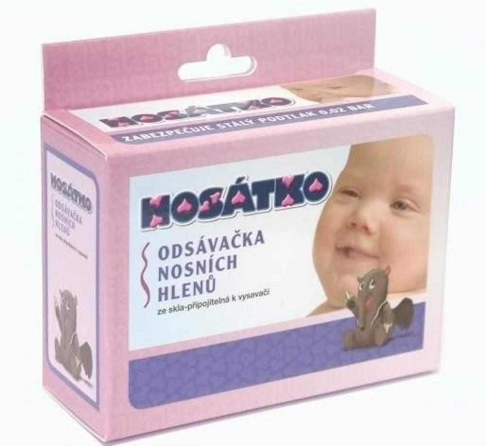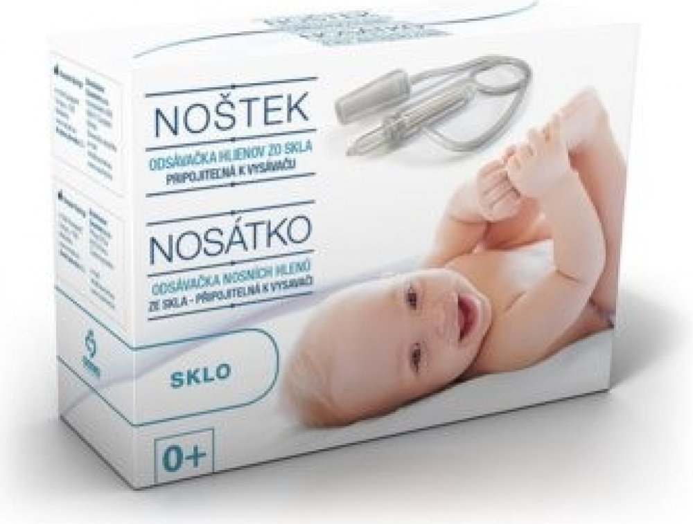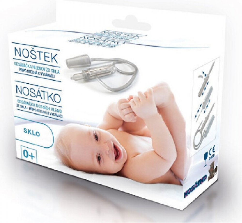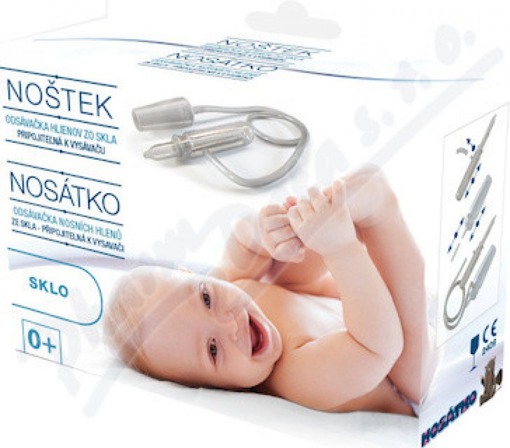 NOSÁTKO Odsávačka nosních hlenů je odsávačka hlenů s napojením na domácí vysavač. Sací hlavice je vyrobana ze skla, ostatní komponenty z plastu. Odsávačka se používá na odstranění nashromážděných hlenů z nosních dutin u malých dětí. Je připojitelná k běžným typům domácích vysavačů. Používáním odsávačky se podstatně urychlí hojení podrážděných dýchacích cest a ulehčí se dýchání. Odsávačka je sterilizovatelná a byla klinicky testována.