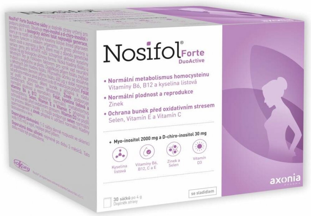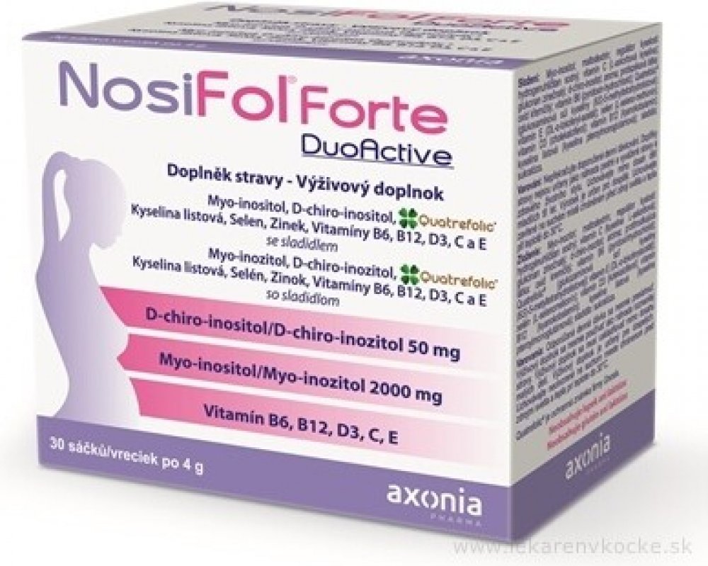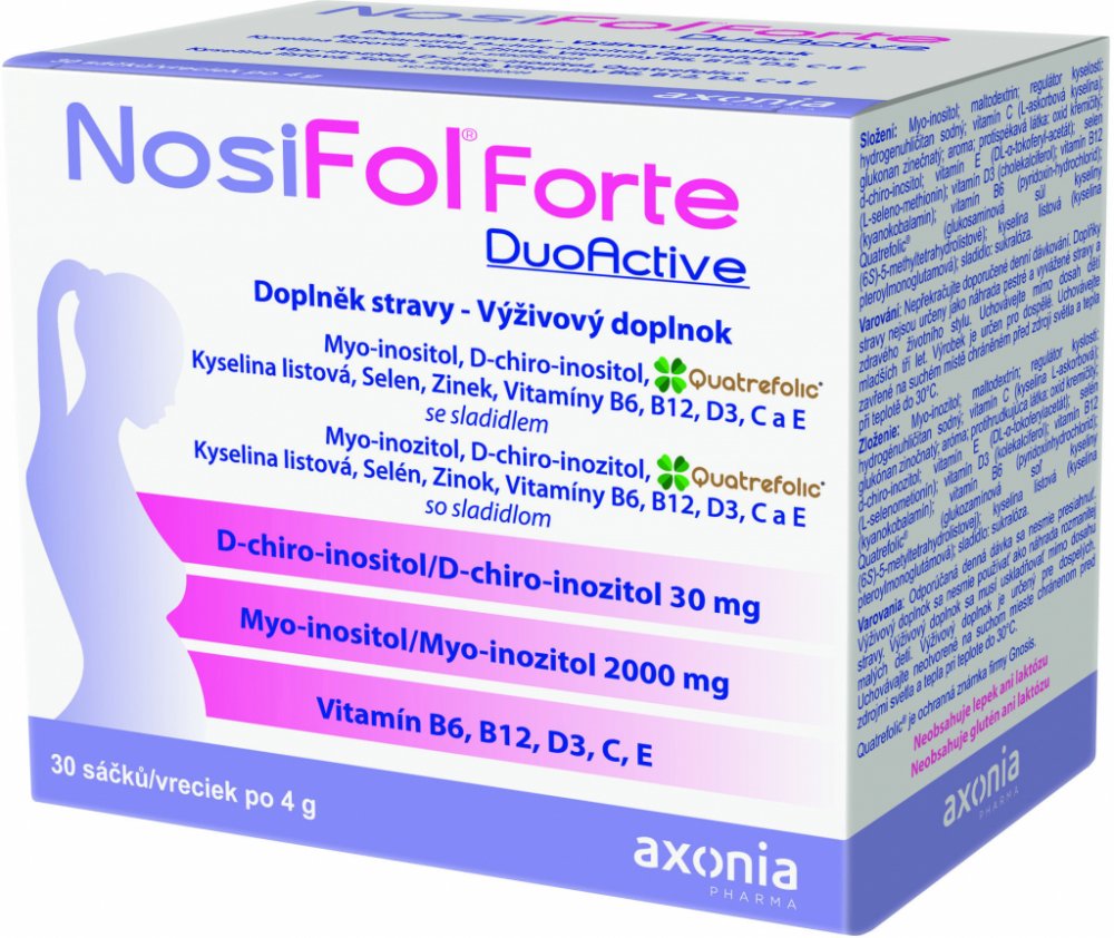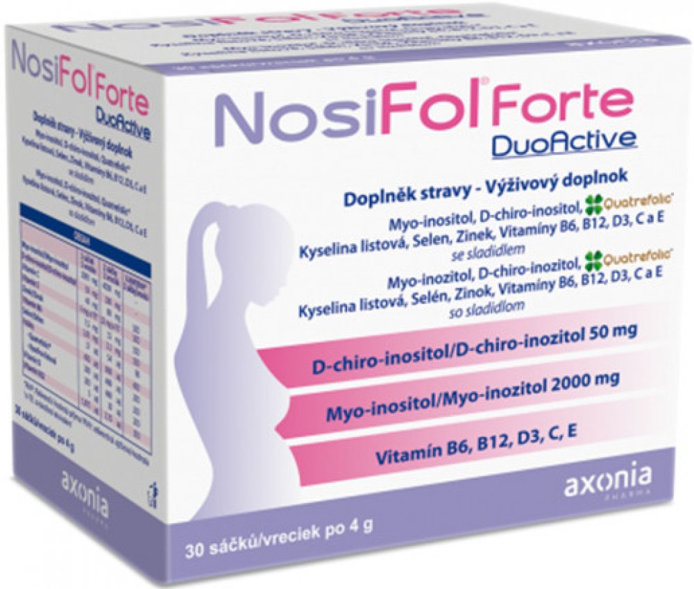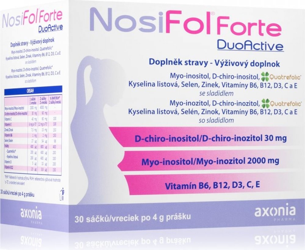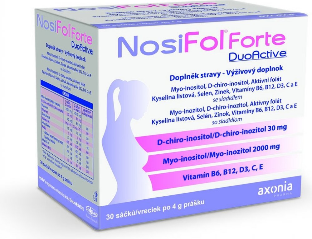 NosiFol Forte DuoActive je doplněk stravy s obsahem myo-inositolu a d-chiro-inositolu, biologicky aktivního folátu nejnovější generace Quatrefolic®, zinku, vitamínů B6, B12, selenu, vitamínu C, vitamínu D3 a vitamínu E.