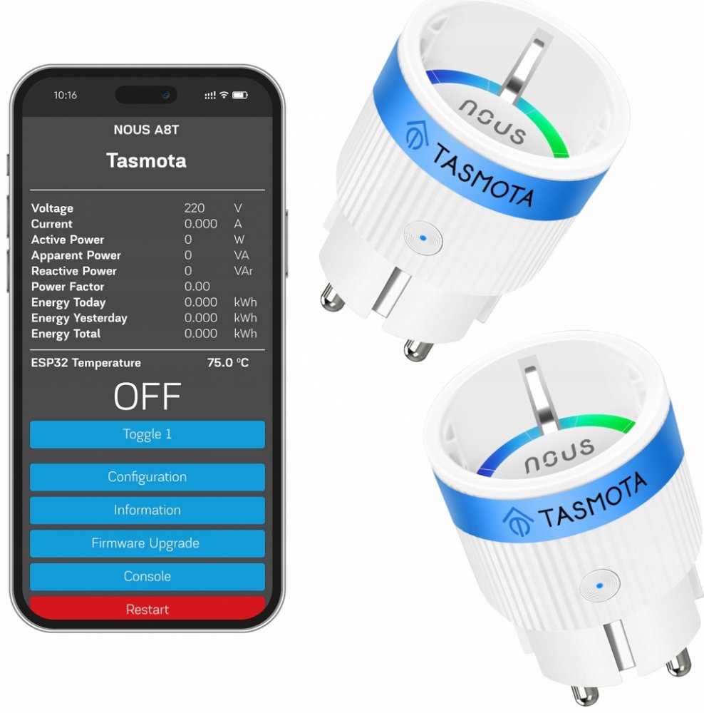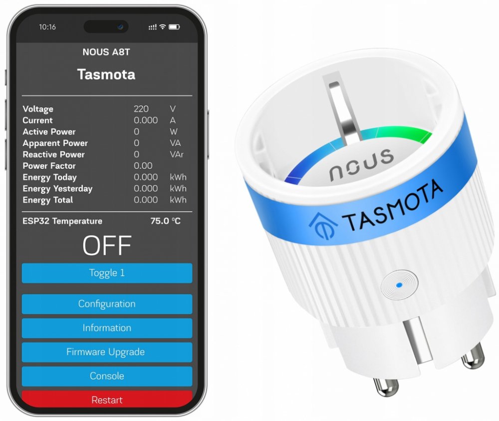 Máte v plánu sestavování chytré domácnosti či pouze chcete z normálních spotřebičů udělat chytré? Potom byste si určitě měli pořídit chytrou zásuvku NOUS. Ta vám dovolí zapojené spotřebiče vypínat v předem nastavený čas. Má systém, který je otevřený, což znamená, že podporuje nejrozšířenější komunikační standardy. Mimo to umí měřit celkovou spotřebu energie. Nous A8T WiFi Smart zásuvka s Tasmota firmwarem do 10A zvládá fungovat samostatně bez nutnosti připojení k centrální jednotce. SMART zásuvka spolupracuje s aplikací výrobce. Bezdrátové připojení k této zásuvce probíhá prostřednictvím WiFi 2,4 GHz. Její konstrukce čítá jednu zásuvku. Tento model pracuje s aplikací, která je v angličtině. Hodnota stupně krytí je IP20, je tak vhodná do vnitřních prostor. Chytrá zásuvka NOUS umožní zapojení zařízení, která nemají zátěž větší než 2300 W. Významné funkce chytré zásuvky Nous A8T WiFi Smart zásuvka s Tasmota firmwarem do 10A Chytrá zásuvka udělá z běžného spotřebiče chytrý Lze s ní nastavit čas vypnutí a zapnutí