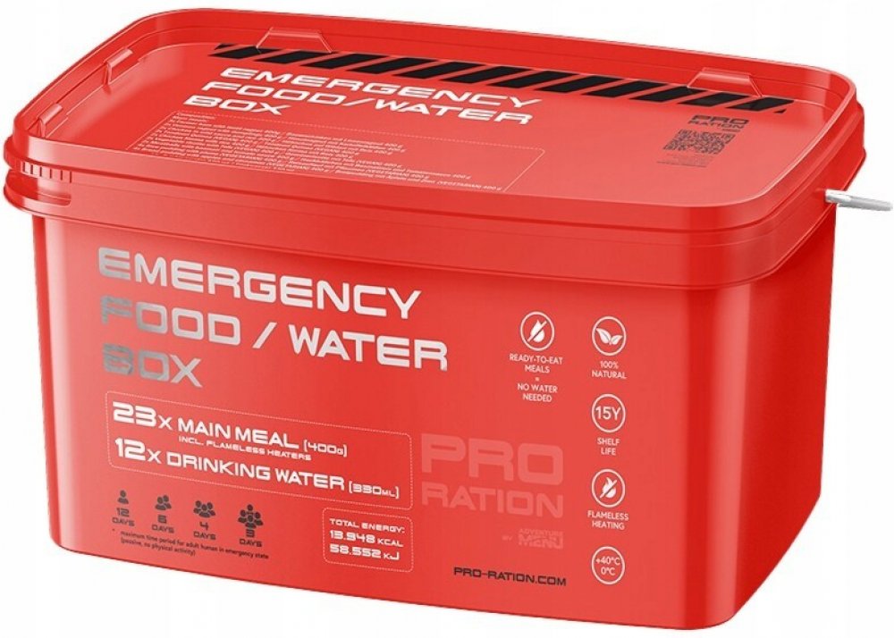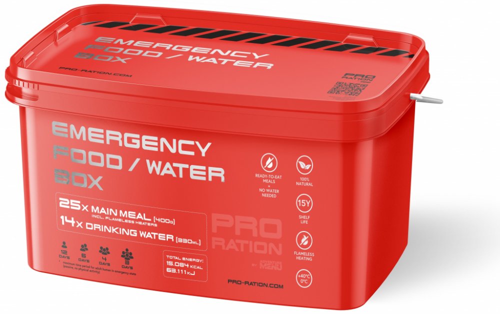 Emergency food/water pack, Menu jsou krizové zásoby s 15letou trvanlivostí. Obsahuje 23 porcí jídla – tedy kompletní zásobu pro čtyřčlennou rodinu na 72 hodin. PRO-RATION Emergency Pack MENU je výsledek více než dvouleté spolupráce s českými záchrannými složkami. Tento kompaktní balíček vám zajistí kvalitní stravu a pitnou vodu na kritické chvíle s trvanlivostí až 15 let u jídla a 50 let u vody.