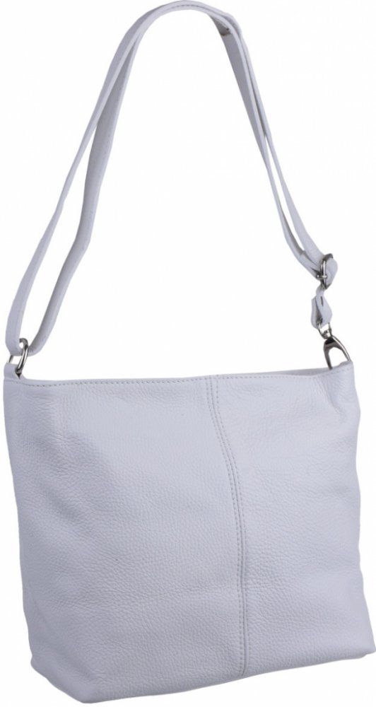 Bílá kabelka nositelná přes rameno či cross-body (křížem). Tato kožená kabelka je uzavíratelná na zip. Uvnitř kabelky najdeme přepážku uprostřed, která zároveň slouží jako kapsa na zip, a na boční stěně pak kapsu na zip. Hloubka jejího dna je 13 cm. Kabelka má navíc nastavitelný popruh s maximální délkou cca 120 cm.