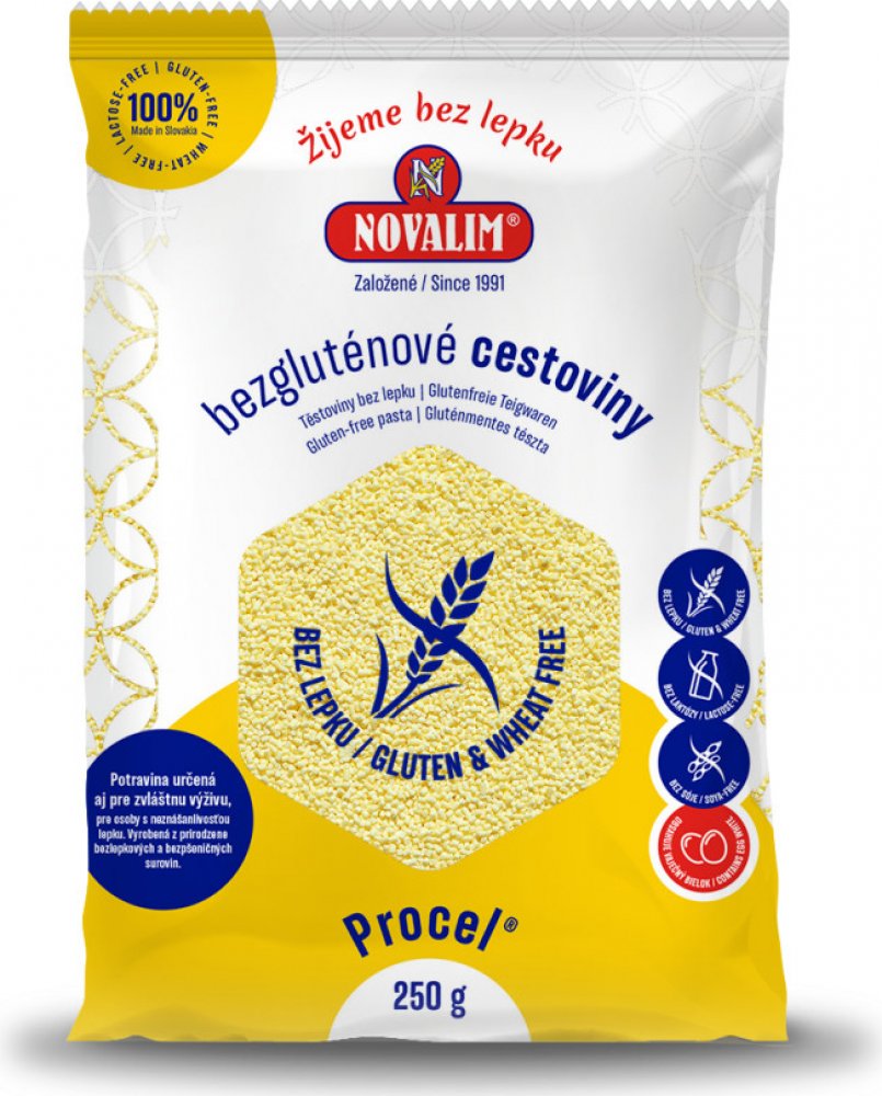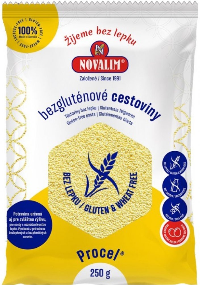 Složení: kukuřičný škrob, modifikovaný kukuřičný škrob, sušený vaječný bílek, emulgátor: mono a diglyceridy nenasycených mastných kyselín, přírodní barvivo kurkuma. Balení: 250 g Novalim Toto je motto naší firmy, která se od roku 1991 specializuje na výrobu dietních bezglutenových (bezlepkových) a nízkobílkovinových potravin. Máme vybudované samostatné provozy, kde se vyrábìjí pouze bezglutenové výrobky. Pracovníci naší firmy mají dlouholeté zkušenosti v oblasti potravináøské technologie, mikrobiologie a v pøíbuzních oborech. Kontinuální výzkum a vývoj realizujeme samostatnì i v spolupráci s významnými výzkumnými centry. Tím zajišťujeme stálou inovaci produkce a dynamický rozvoj společnosti. Náš příběh Společnost NOVALIM byla založena v roku 1991 a specializuje se na vývoj a výrobu bezglutenových (bezlepkových) a nízkobílkovinových výrobků. Zakladatel, Ing. Jozef Poprac, CSc., využil své dlouholeté zkušenosti z působení ve výzkumu a vývoji potravinářských výrobků a výsledkem je různorodá paleta kvalitních bezglutenových a nízkobílkovinových výrobků, které společnost NOVALIM nabízí svým zákazníkům prostřednictvím E-shopu, v maloobchodech i v lékárnách. Poloha Slovenska v srdci Evropy umožňuje společnosti efektivně zásobovat evropský trh. Klademe důraz na bezpečnost našich výrobků, a proto nepoužíváme pšeničný škrob, který může být nosičem zbytkového glutenu (lepku). Rovněž v největším možném rozsahu využíváme přírodní suroviny. Základními ingrediencemi v našich produktech jsou kukuřičný a bramborový škrob a rýžová, kukuřičná a sójová mouka. Pro pravidelné sledování bezpečnosti výrobků má společnost NOVALIM zaveden tzv. systém HACCP a certifikaci společností Bel-Novamann International. Suroviny a produkty navíc podléhají stálé kontrole Úřadem veřejného zdravotnictví Slovenské a České republiky Naše provozovny jsou specializované pouze na výrobu bezglutenových (bezlepkových) výrobků. Všechny naše výrobky jsou vyrobeny z přirozeně bezglutenových a nepšeničných surovin.