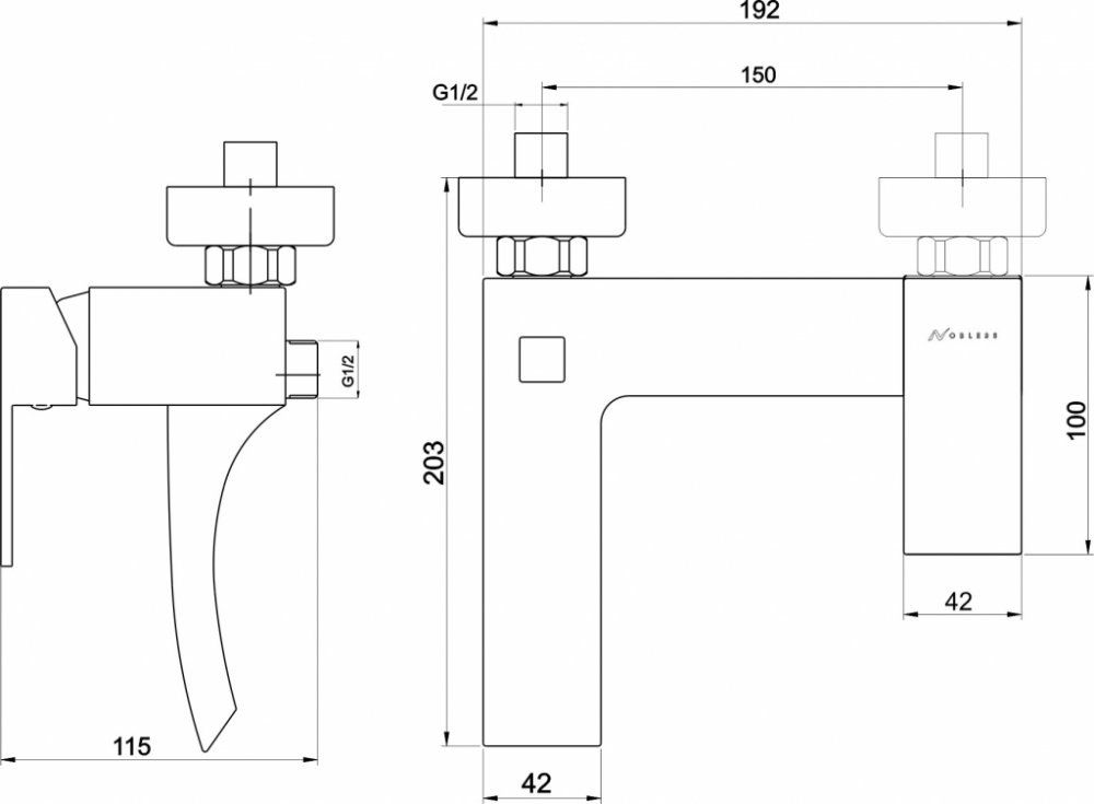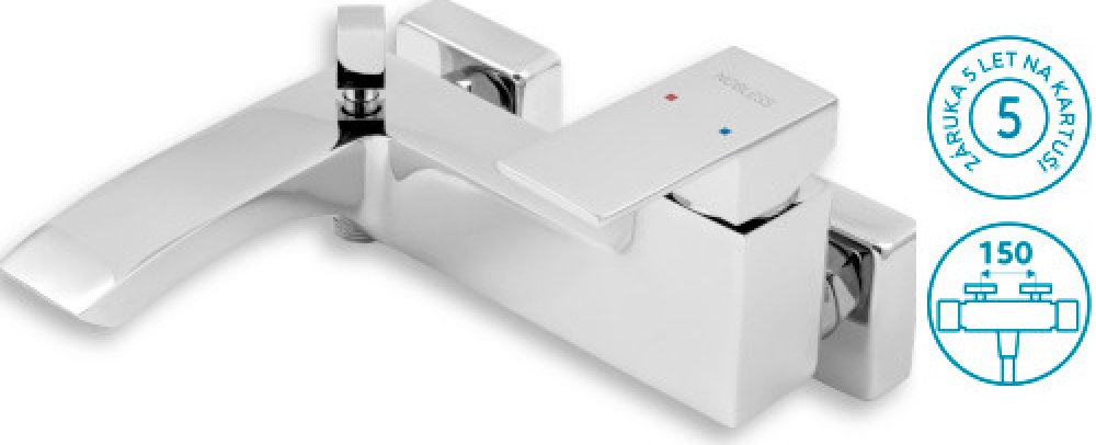 Vanová nástěnná baterie s keramickou kartuší 35 mm, kovovým aretačním přepínačem a roztečí 150 mm. Povrchová úprava – chrom.