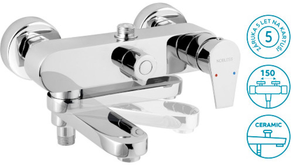 na hadici a sprchový set Kvalitní a odolná keramická kartuše 35 mm s prodlouženou zárukou 5 let. Prvotřídní chromové provedení. Vanová/sprchová nástěnná baterie s roztečí 150 mm a 2 šikovnými keramickými přepínači. Otočné rameno funguje jako přepínač vana/sprcha (0-90°). Ve sklope...