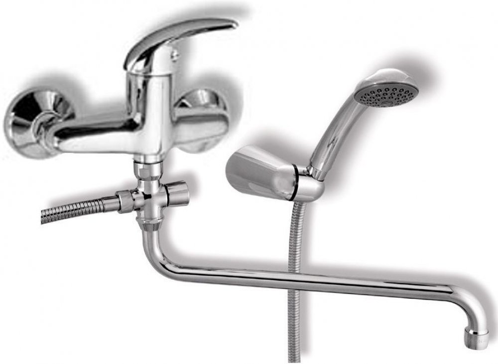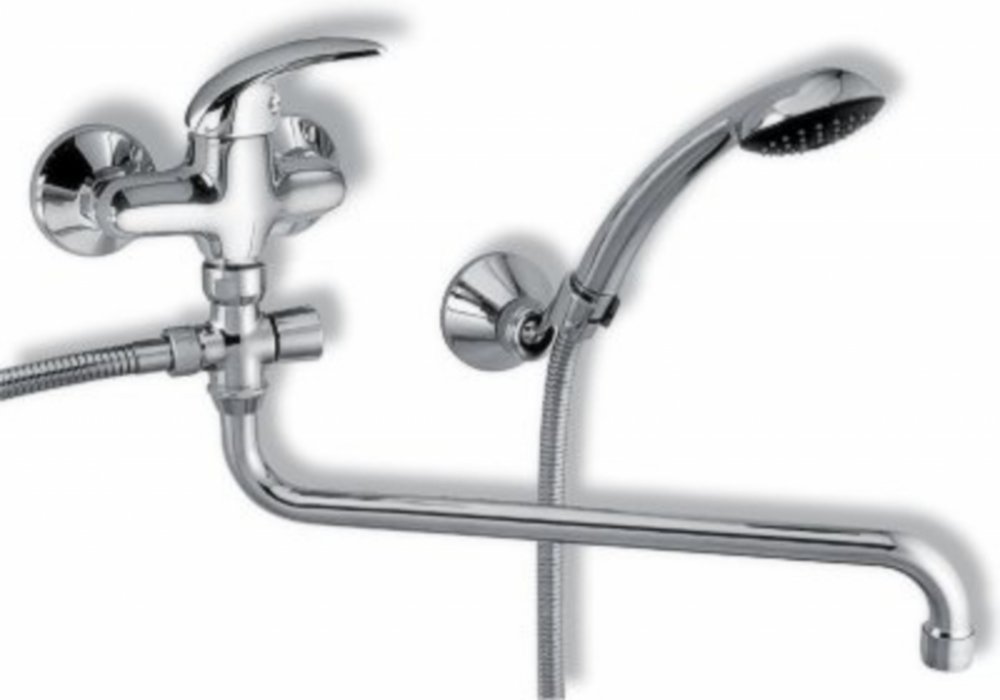 Paneláková nástěná vanová baterie se samočistící sprchovou růžicí, vícezámkovou kovovou hadicí a kloubovým držákem sprchy. Délka výtokového ramínka je 320 mm. Rozteč 150 mm.