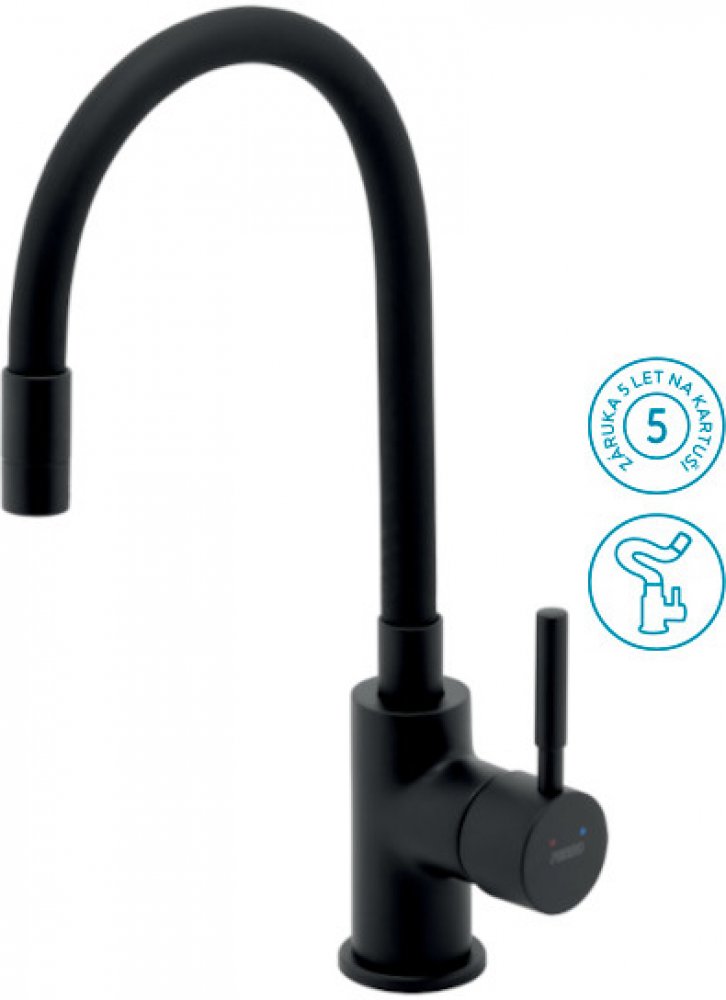 Kvalitní a odolná keramická kartuše 35 mm s prodlouženou zárukou 5 let. Prvotřídní provedení černá-mat. Stojánková dřezová baterie s FLEXI ramenem. Součástí baterie jsou přívodní hadičky.Udělejte z vaší kuchyně váš oblíbený prostor. Praktická a moderní dřezová baterie v black style s elastickým ramenem bude vaším oblíbeným pomocníkem v kuchyni. Osloví vás svou nápaditostí a ukáže vám, že i vodovod...